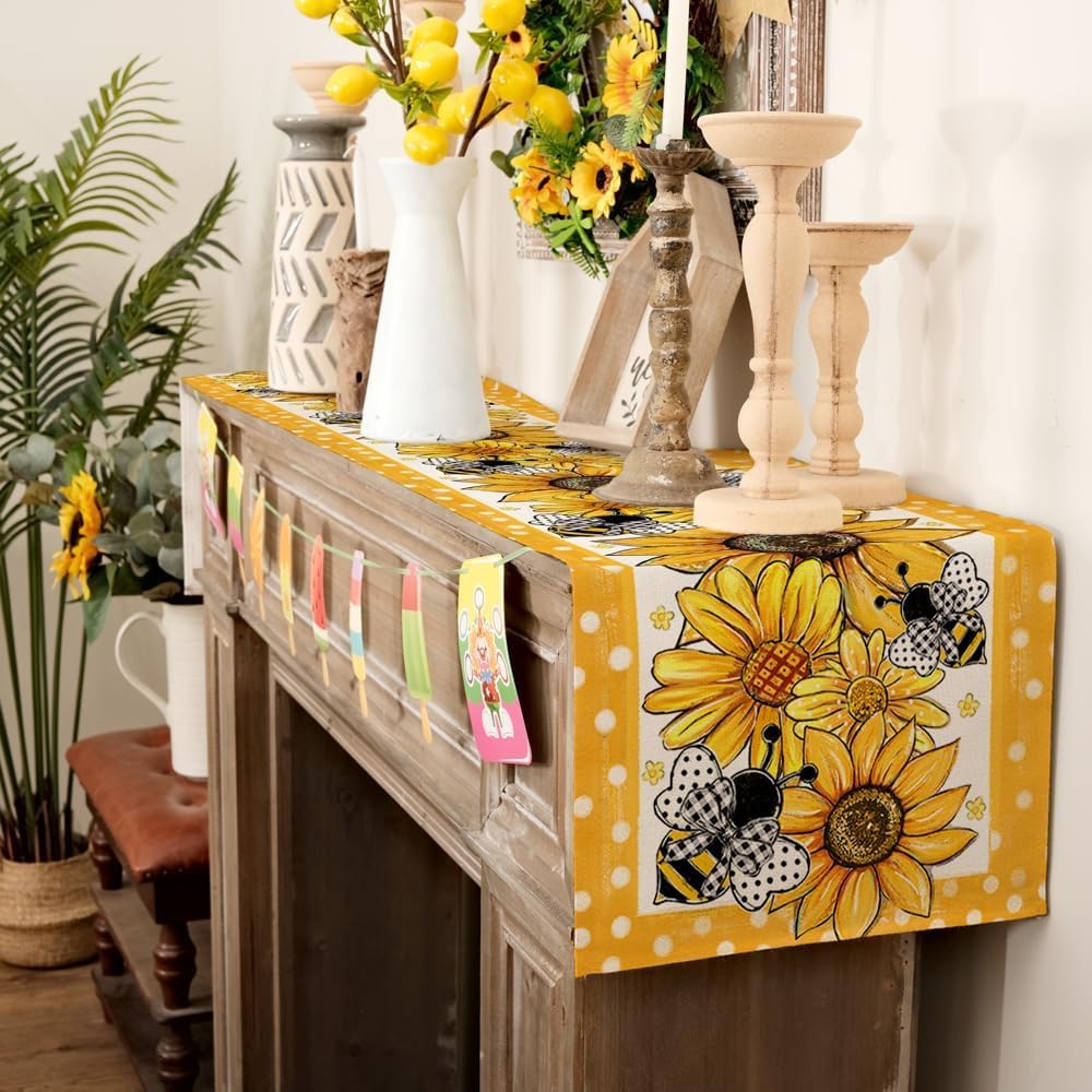 ARKENY Summer Table Runner 13×72 Inches, Sunflower Bee Yellow Seasonal Farmhouse Polka Dot Burlap Indoor Kitchen Anniversary Dining Table Decor for Home Party AT611-72