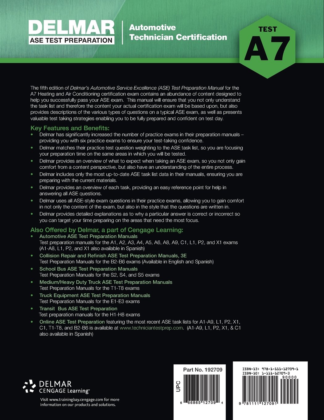 The fifth edition of Delmar�s Automotive Service Excellence (ASE) Test Preparation Manual for the A7 HEATING AND AIR CONDITIONING certification exam contains an abundance of content designed to help you successfully pass your ASE exam. This manual will ensure that you not only understand the task list and therefore the content your actual certification exam will be based upon, but also provides descriptions of the various types of questions on a typical ASE exam, as well as presents valuable test taking strategies enabling you to be fully prepared and confident on test day.