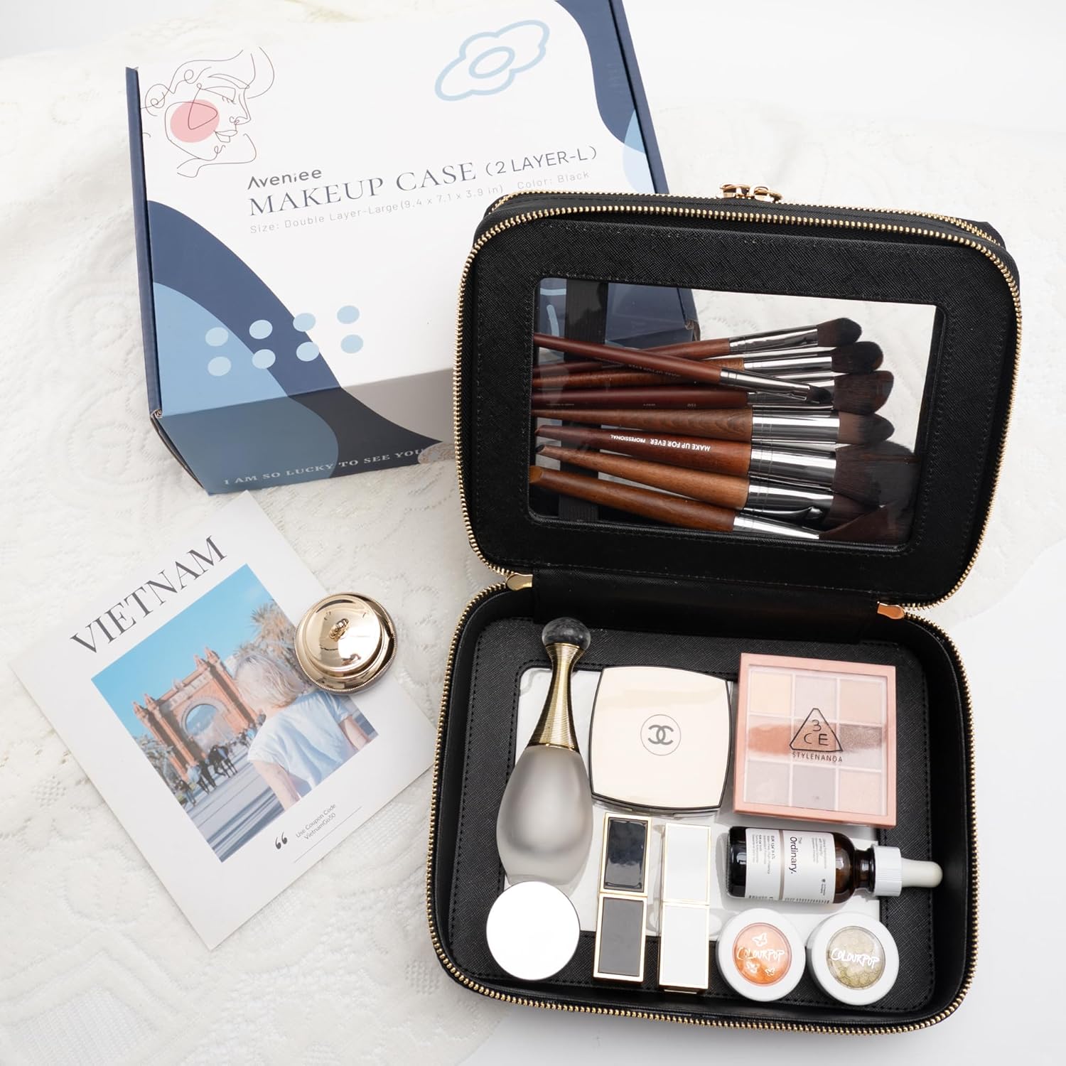 Aveniee Clear Makeup Bags, Double Layer Cosmetic Bags with a Separate Brush Compartment, Travel Toiletry Bag Train Case for Women, Travel Accessories Organizer for Purse(2 Layers Large, Black)
