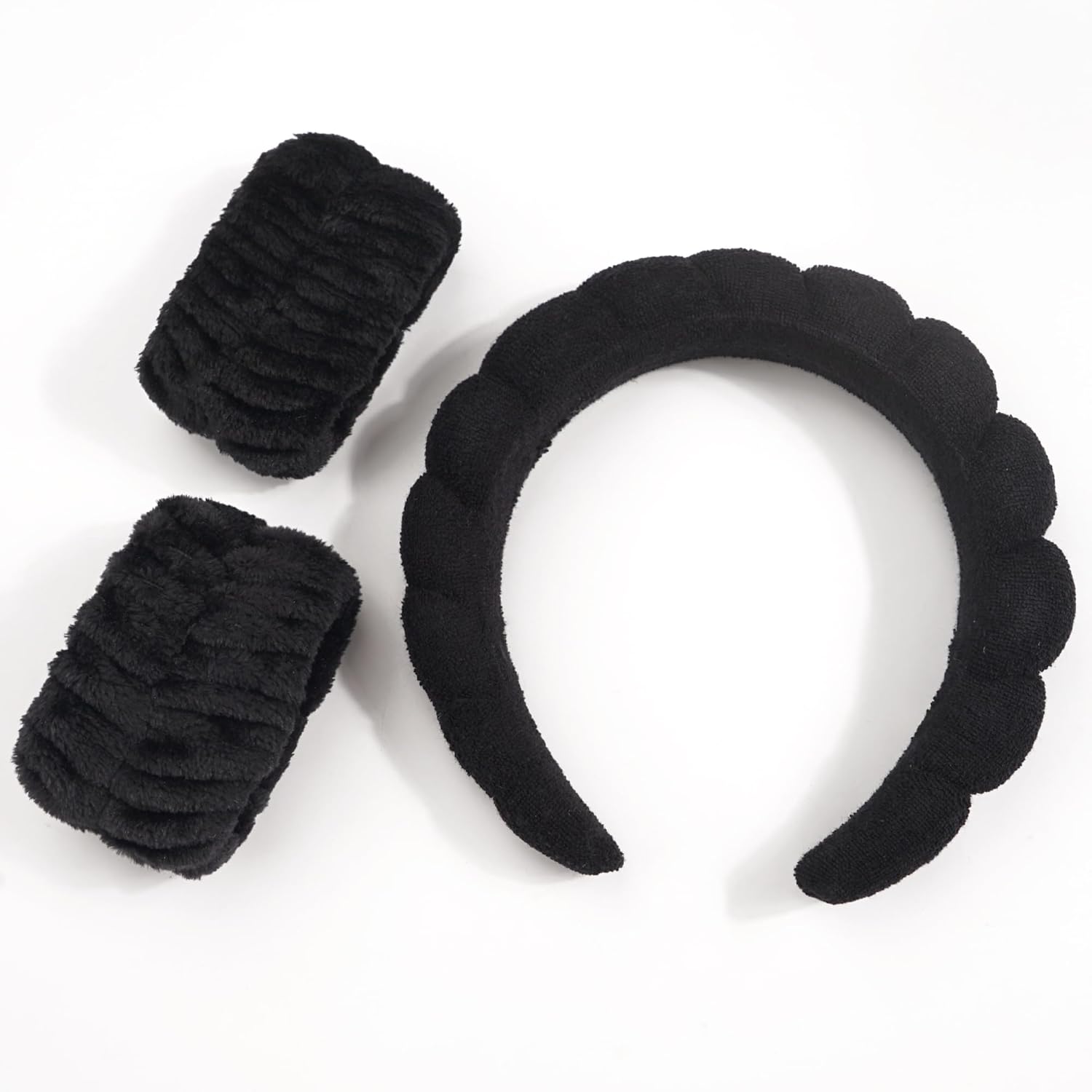Ayesha Spa Headband and Wristband Set for Skincare Washing Face Terry Cloth Wrist Towels Head Band for Skin Care Bubble Soft Hairband for Women Girls Makeup Shower(Black set)