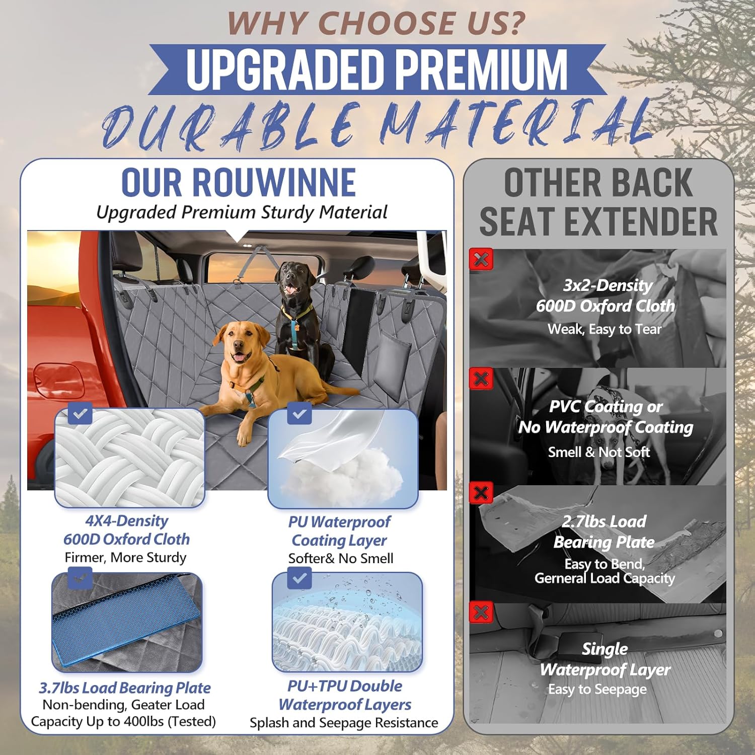 【HARD BOTTOM, 400LBS LOAD】 ROUWINNE backseat extender for dogs for truck is more sturdy and stable than other soft bottom truck dog hammock, can hold up to 400 pounds (tested). Ideal for large dogs, older dogs, or a multi-dog family. This truck dog seat cover back seat has 3.7lbs hard bottom boards much more sturdy than other 2.7lbs boards in the market, that can be fold up to for person sit aside or to accommodate a child safety seat.