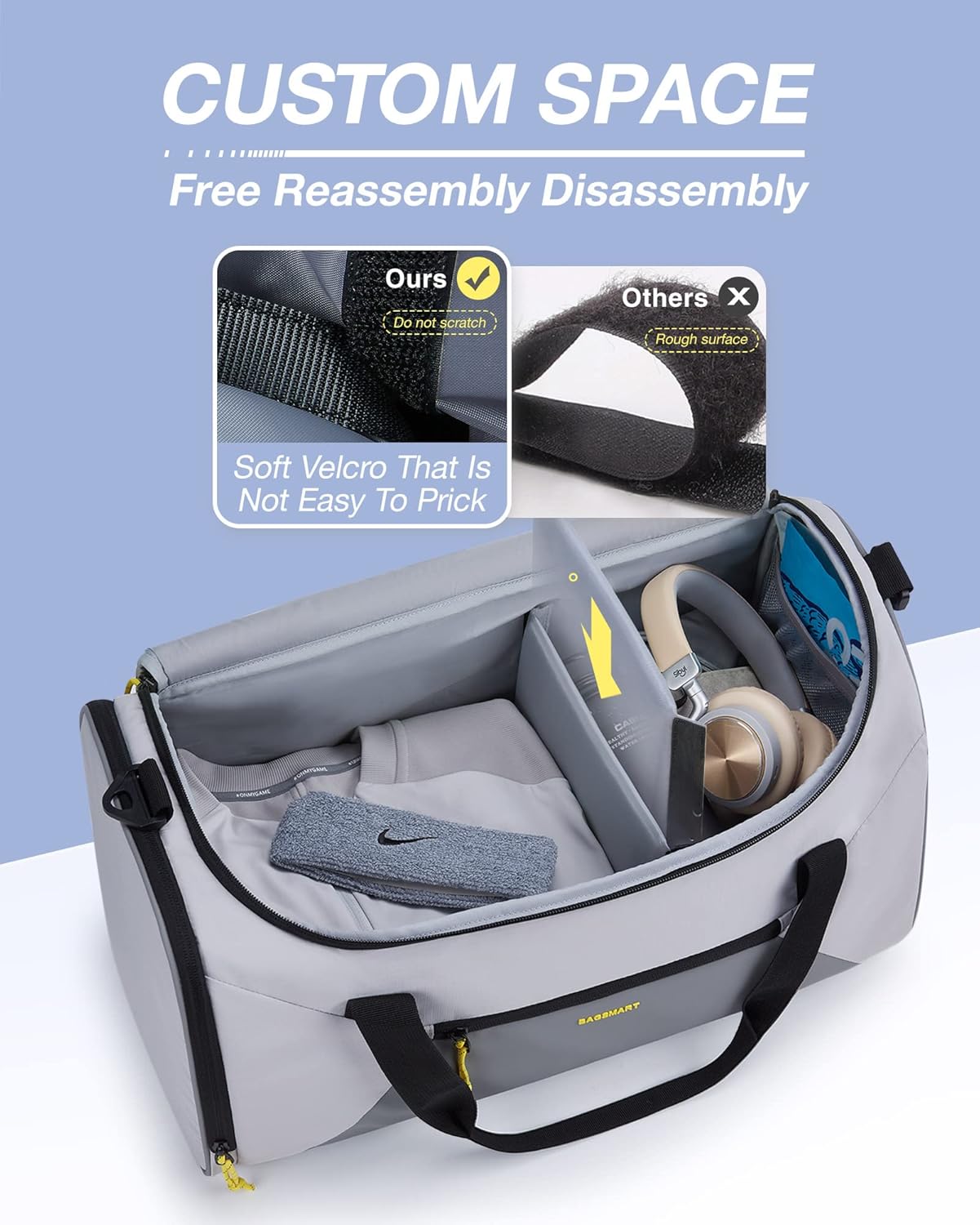 Multi-compartment Gym Bag: Whether you’re working out or traveling, you’ll need a sports duffle bag to give you the perfect storage. The main compartment has built-in removable dividers that you can use/detach as you need them. The waterproof PVC pocket on the left side of the weekender bag is perfect for dirty and wet clothes. An outer handy pocket is for items that you need to keep close by