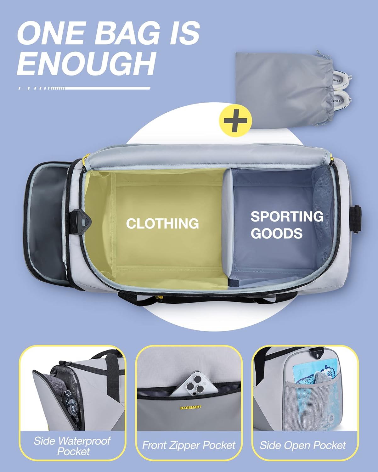 BAGSMART Gym Bag for Women Men, 36L Small Sports Bag With Shoe Bag, Lightweight Weekender Carry On Duffel Bag, Water Resistant Workout Duffel Bags for Traveling – Gray