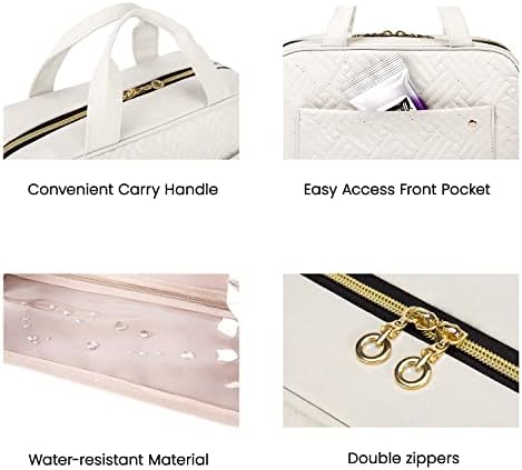 Customers like the quality, hook, organization, and travel of the cosmetic case. They mention that it’s well-made, convenient for traveling, and holds all of their items without taking up too much space in their luggage. Customers also appreciate the smaller compartments and elastic bands in the bag. Overall, customers recommend this product for its quality and functionality.