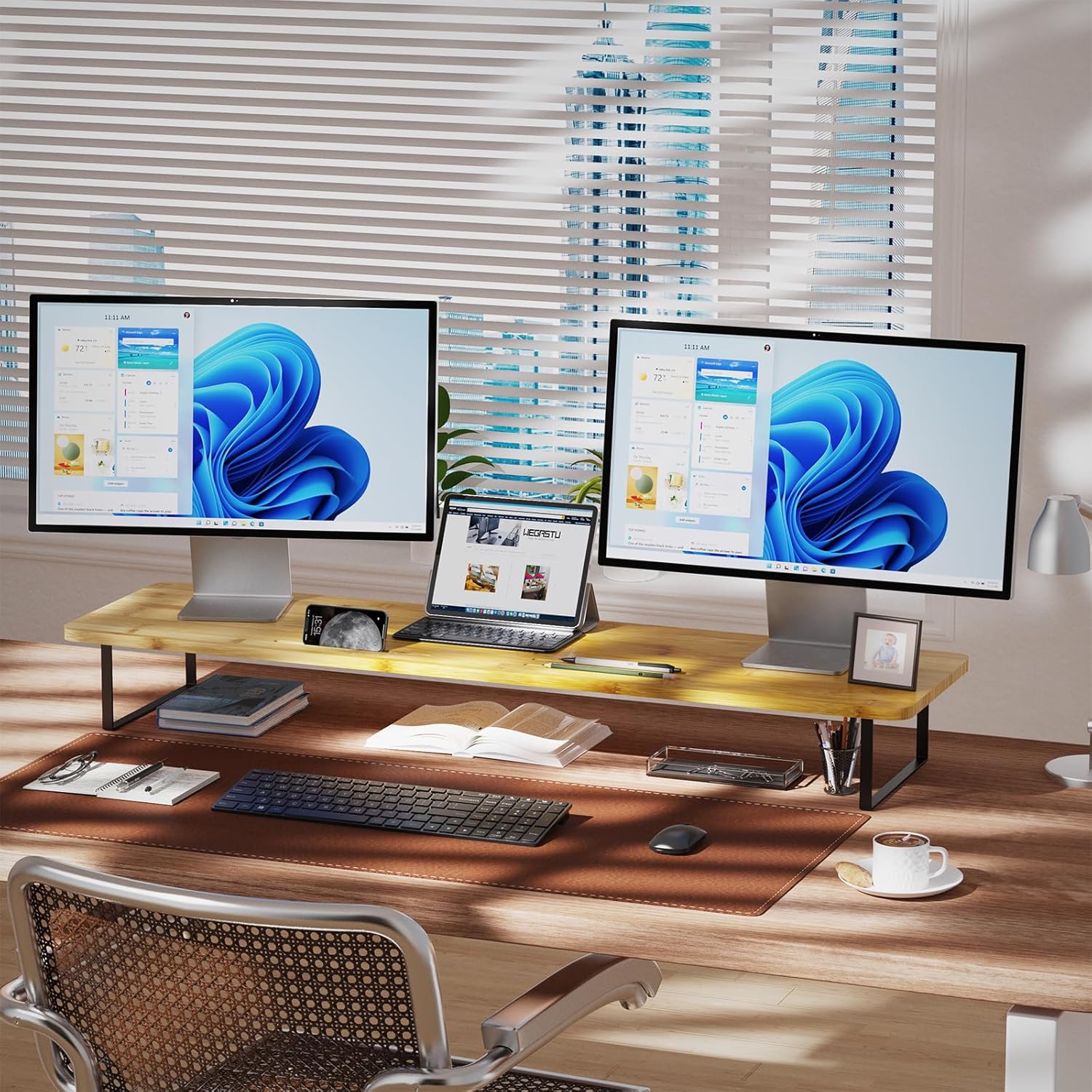 [Huge weight capacity and space saving] : The computer monitor stand lifts the monitor up and cleverly hides the mess. Working accessories such as keyboard and mouse can be placed under the stand to increase desktop space. “