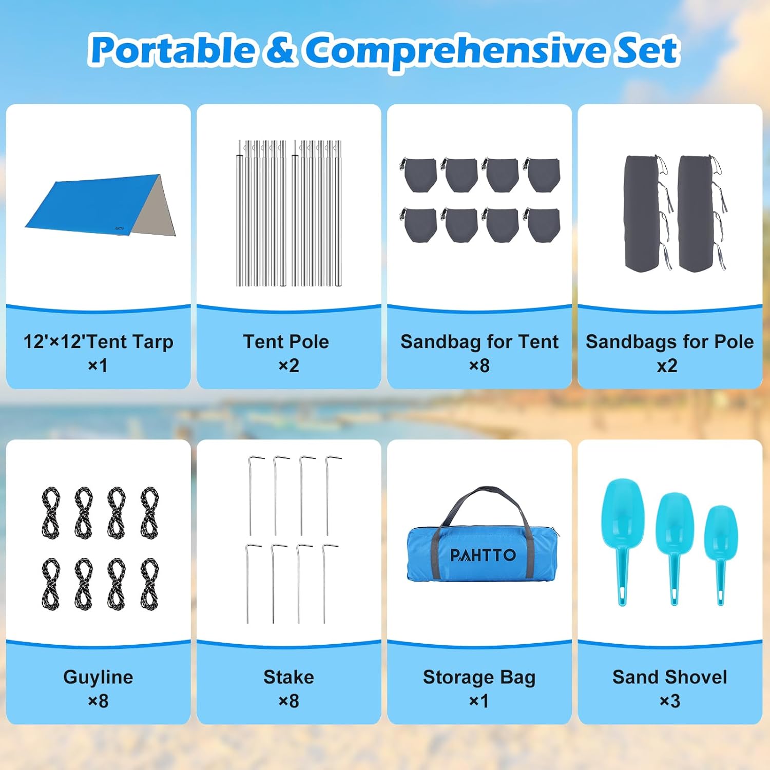 【Wind Resistant and Stable】Equipped with 2 stainless steel poles and 10 sandbags, our sun shelter is reinforced to withstand windy conditions, ensuring stability throughout your beach day. Additionally, 3 shovels are included to expedite setup for your convenience.