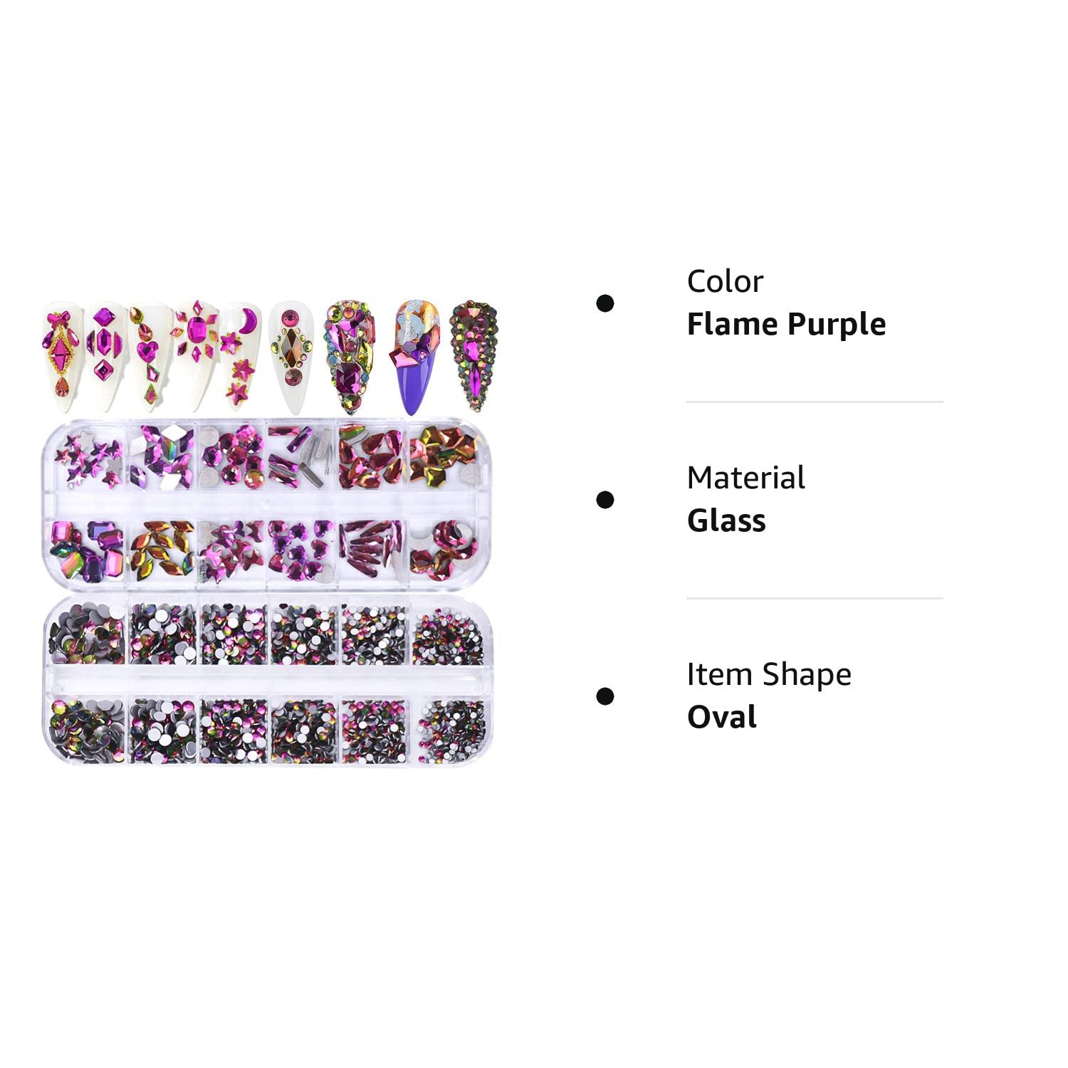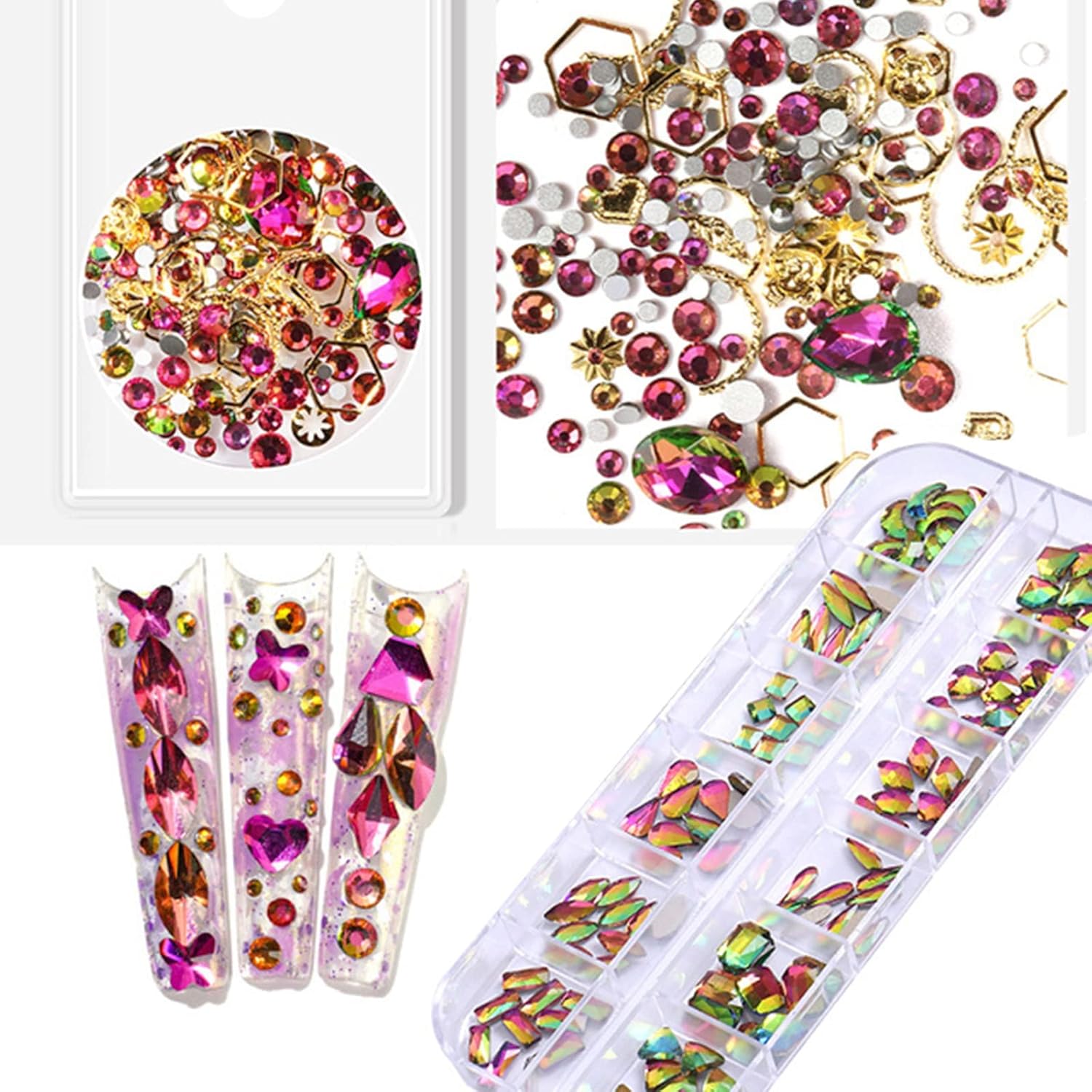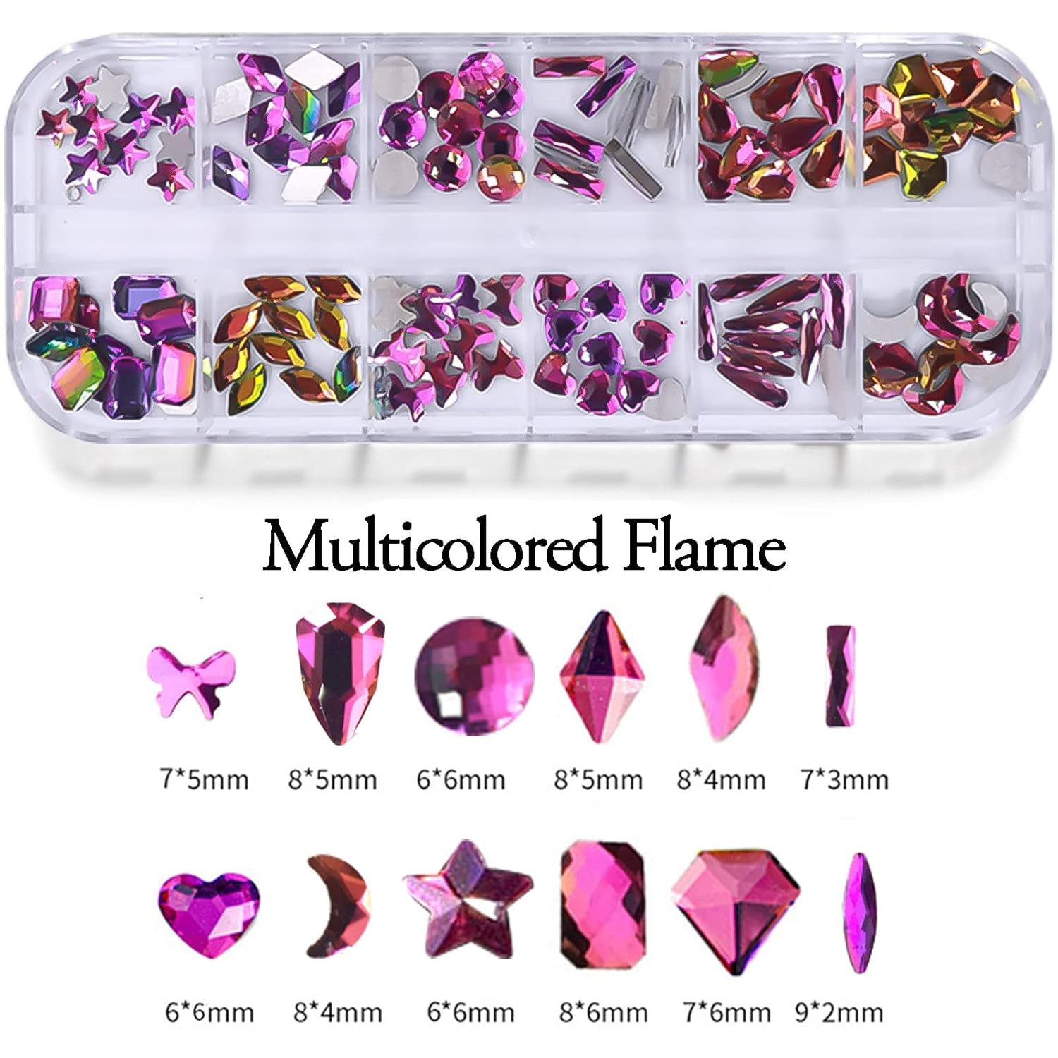 Packaging – Each pack contains 1 box flat Back crystals diamonds and 1 box Multishape nail jewels.The box is with 12 grid nail Gems and crystals with different shapes :Diamond,oval, bow-knot,Star, heart shape and so on. Mixes shaped AB rhinestone designs meet your different daily matching needs