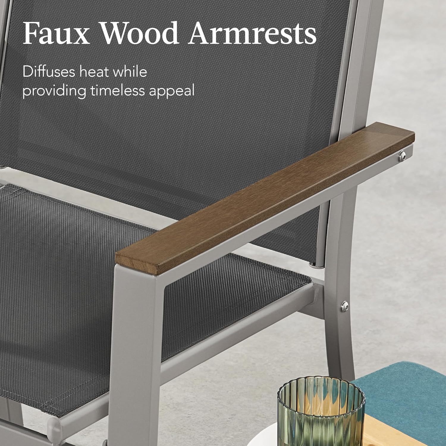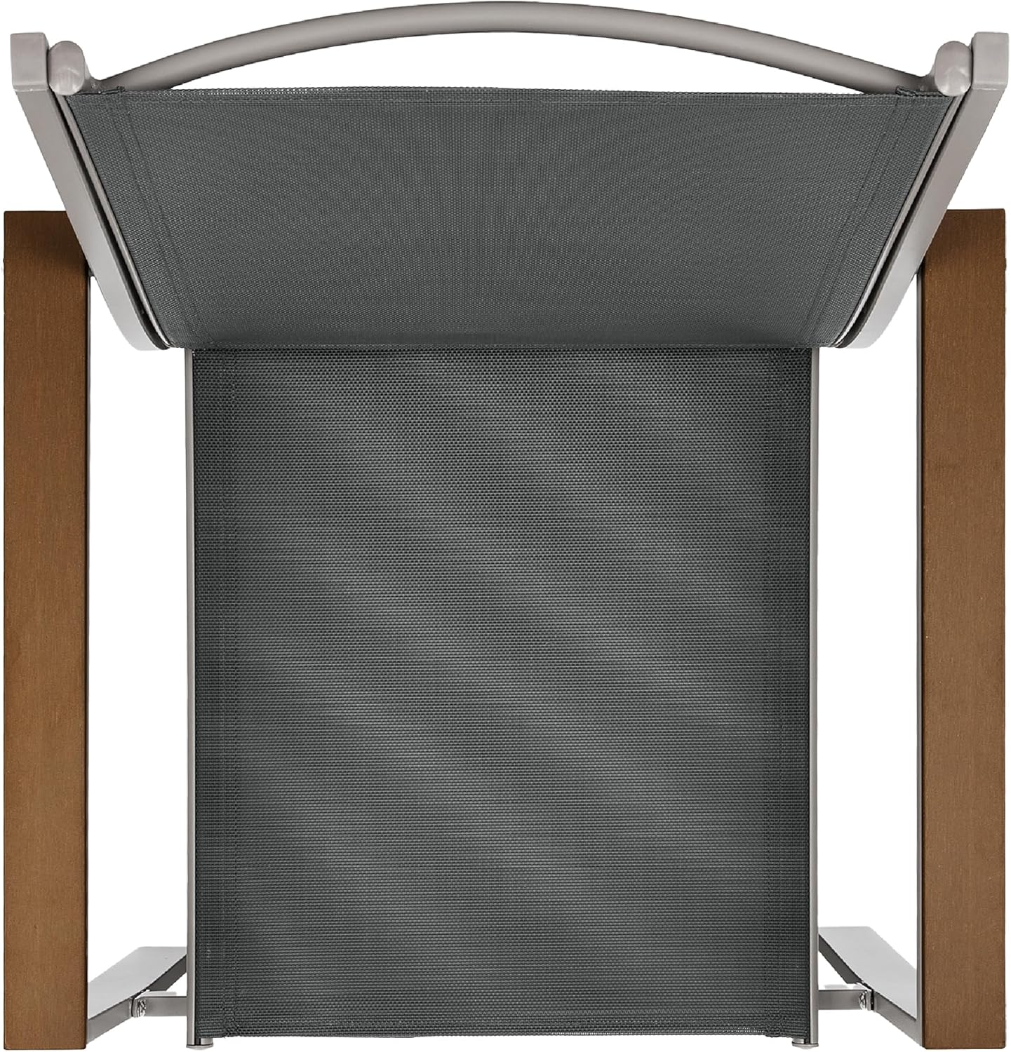 FAUX WOOD ARMRESTS: Accent panels on the steel armrests help elevate the arms for a more relaxed posture and diffuse heat to prevent burns during full-sun conditions