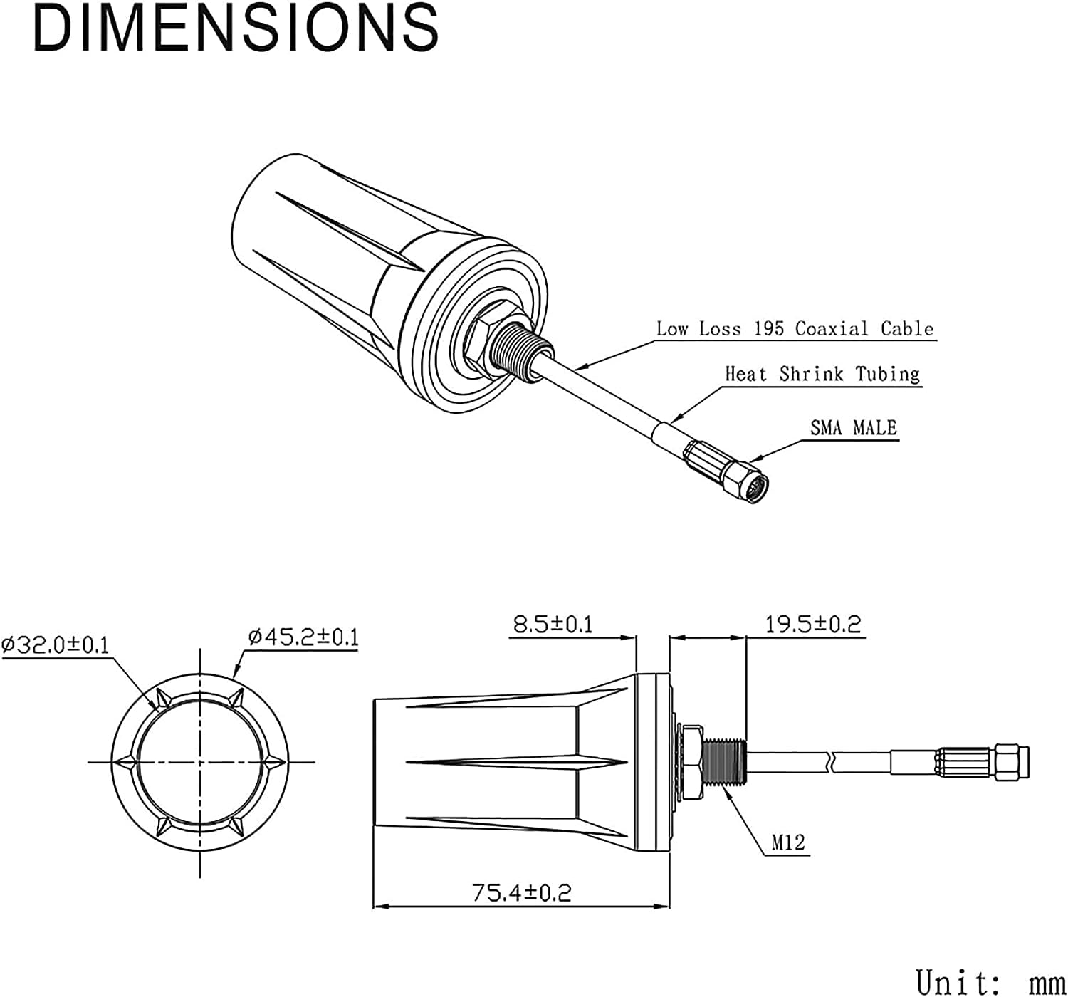 Gain: 5dBiFrequency Range: 698-960 MHz, 1710-2170 MHz, 2300-2700 MHzVSWR: <2.0;Polarization: Linear Vertical;Impedance: 50 ohm;Direction: Omni-directional;Feature: Fixed Wall Mount; Thru Hole Mount;Antenna Mounting Screws Diameter: M12 (Hole Diameter: 11.76mm-11.95mm);Connector: SMA Male Connector; with RP-SMA Male Connector Adapter;Cable Type: Low Loss KSR 195 Coaxial Cable;Cable Length: 3m/10 feet;Net Weight: 365g;Waterproof: Rainning Proof;Operating Temperature: -20°С ~ +80°СStorage Temperature: -30°С ~ +85°СPackage List: 1 x Antenna, 1 x RP-SMA Connector Adapter, 1 x Wall Mount Fixed Bracket, 4 x Self-tapping Screws, 1 x SMA Female to Dual TS9 Connector Splitter Cable (As the Picture Shown)