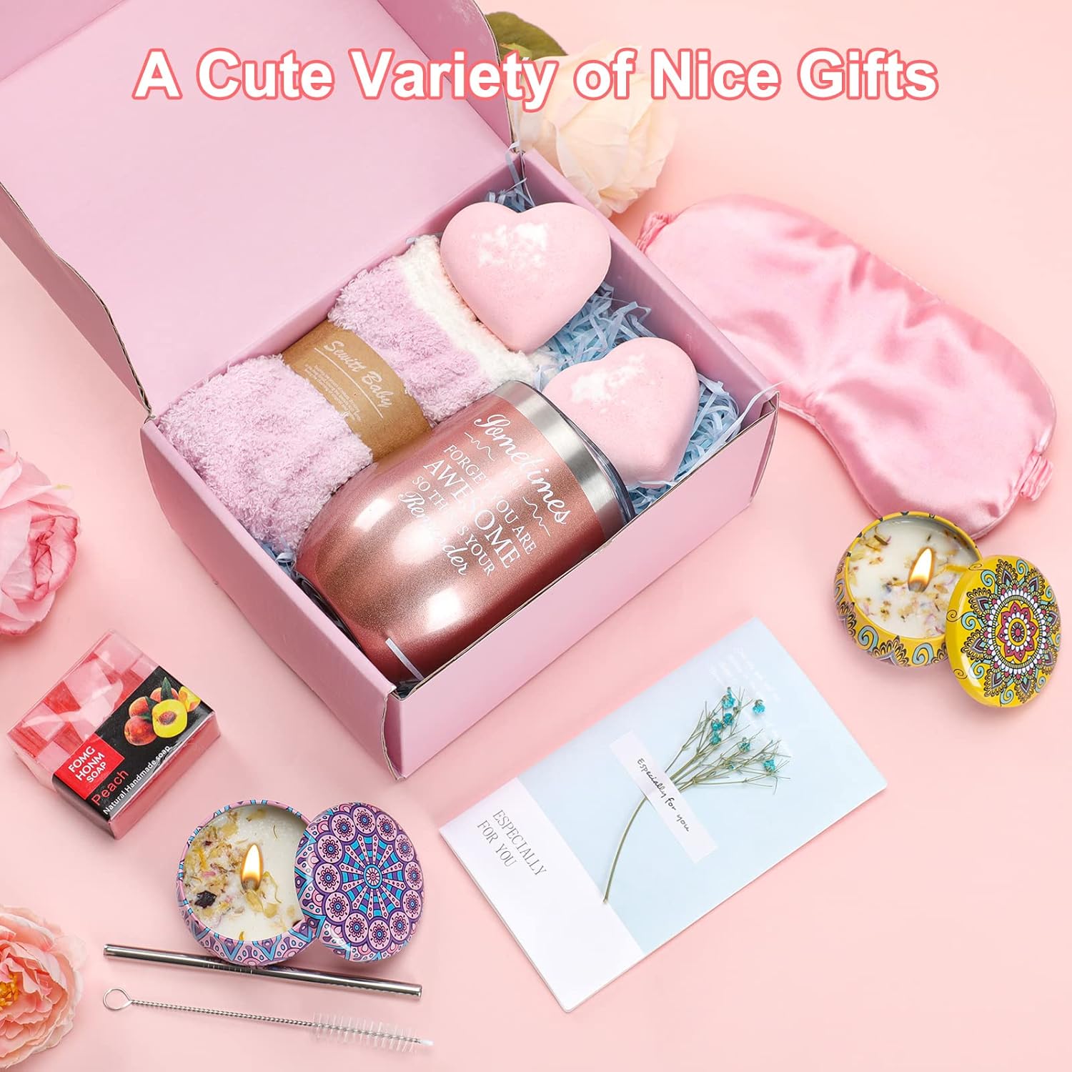 💐11 Items in the Packaging: Including a stainless steel tumbler with lid and straw, a straw cleaner, two soy wax lavender and pear & freesia scented candles, two pink rose bath bombs, a pure manual peach soap, thick fuzzy warm socks, a silk eye mask, and a cute little card. They looked elegant, beautiful, and smelled wonderfully.