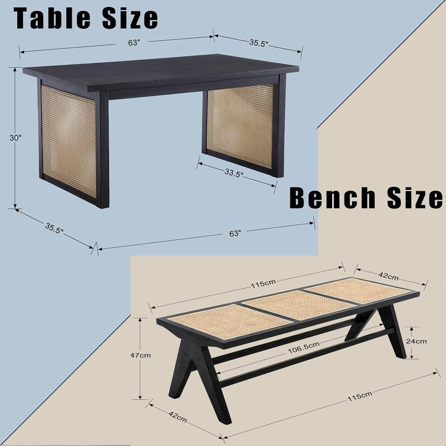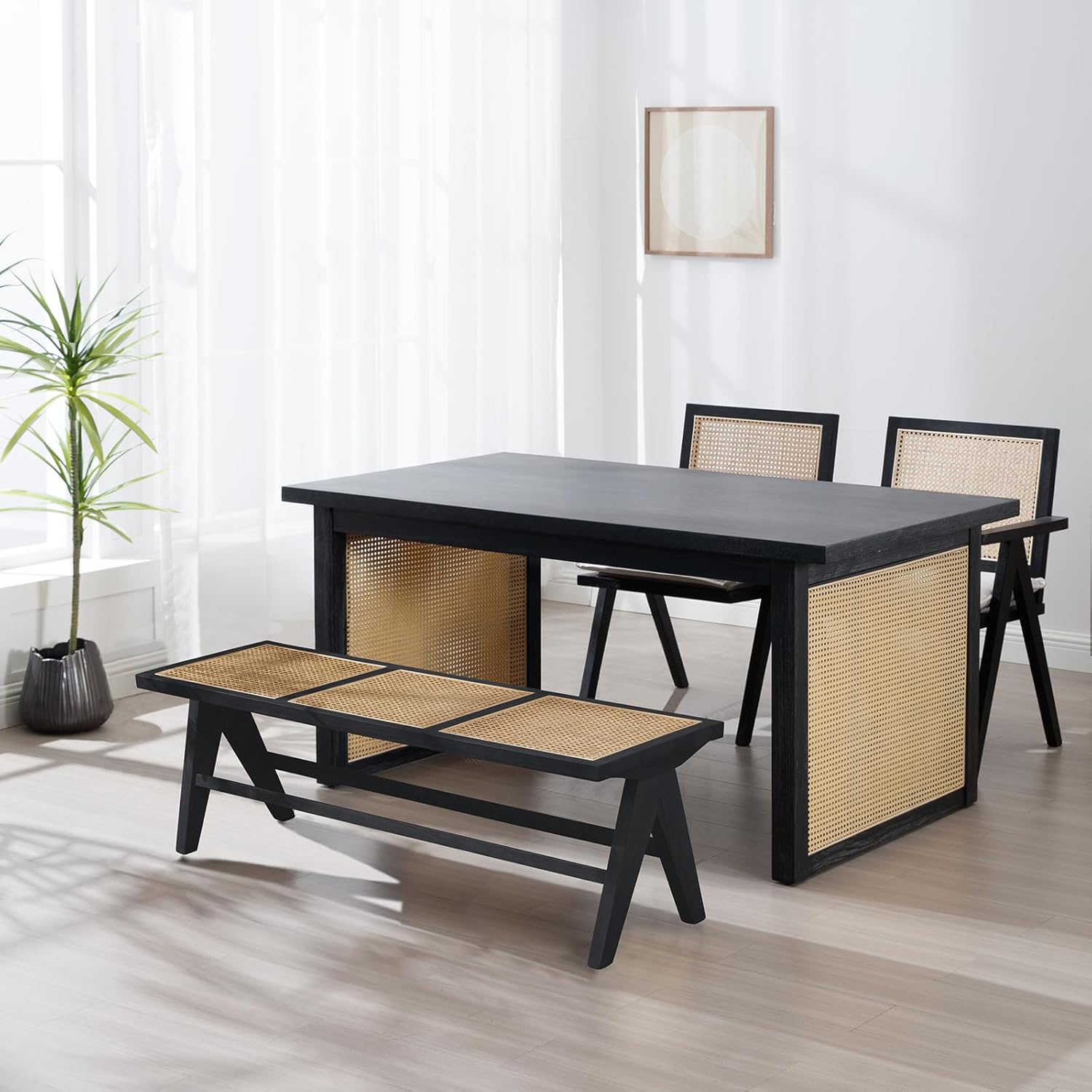 Black Wood Dining Table Set for 4-6 Person, Rattan Rectangular Kitchen Table w/Rattan Bench & 2 Chairs, 4-Piece Farmhouse Home Kitchen Furniture Set for Dining Room/Restaurant/Breakfast