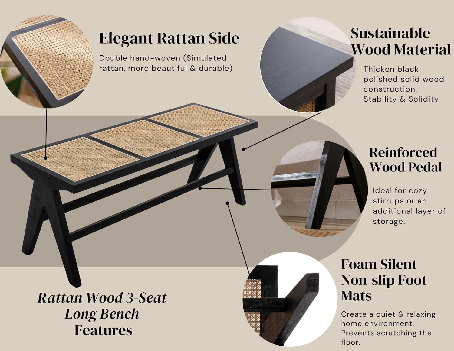 【Solid Materials】Made of heavy-duty, wear-resistant rubberwood material. Chair is made of supportive hand-woven rattan backrest; table&bench made of solid woven rattan. Carefully selected craftsmanship, just to give you a great experience.