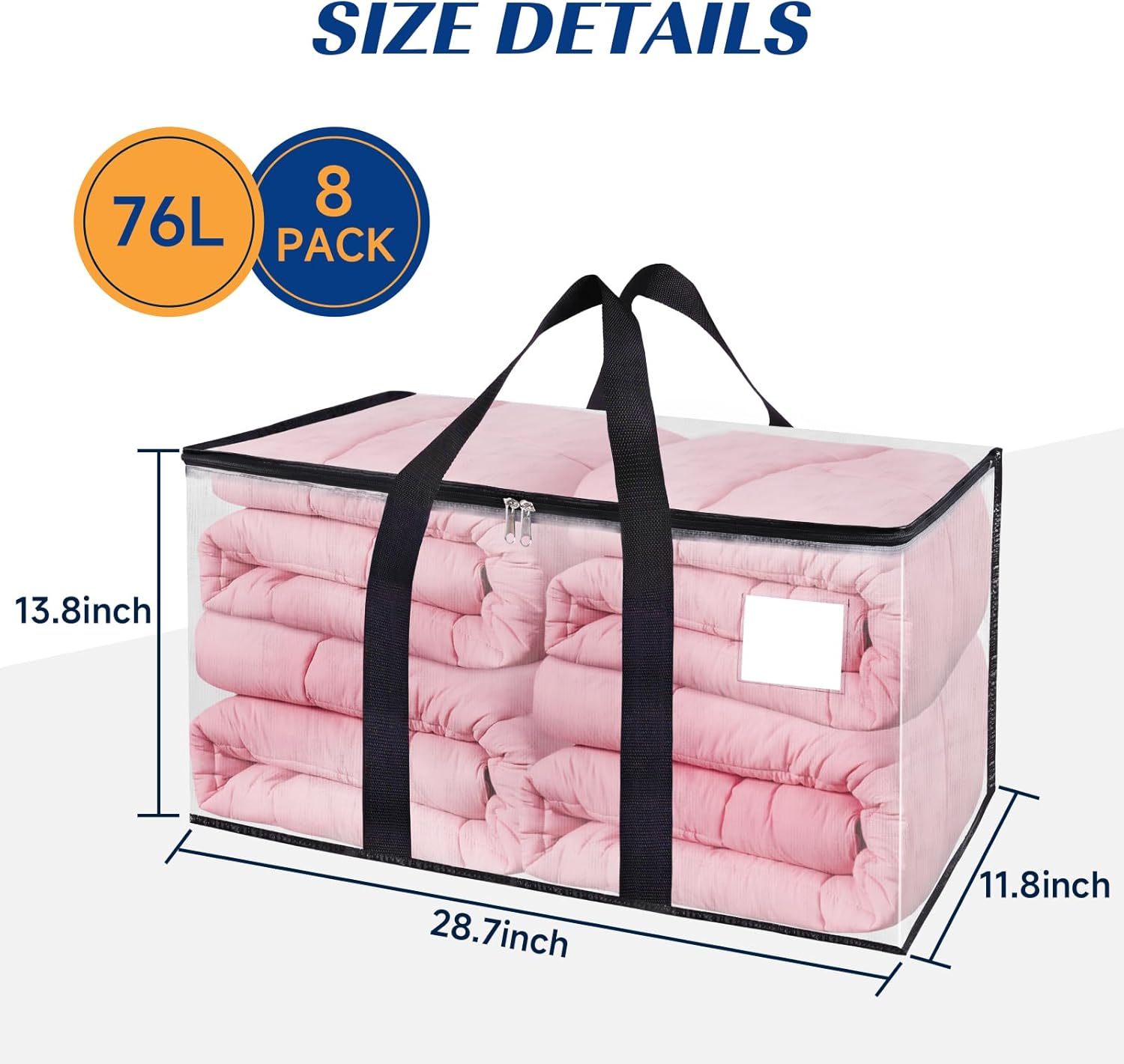 BlissTotes Moving Bags, 8-Pack Storage Bags with Zipper, Moving Bags Heavy Duty Extra Large, Moving Supplies, Clear Packing Bags, Reinforced Handles and Tag Pocket & Collapsible Moving Bags (76L)