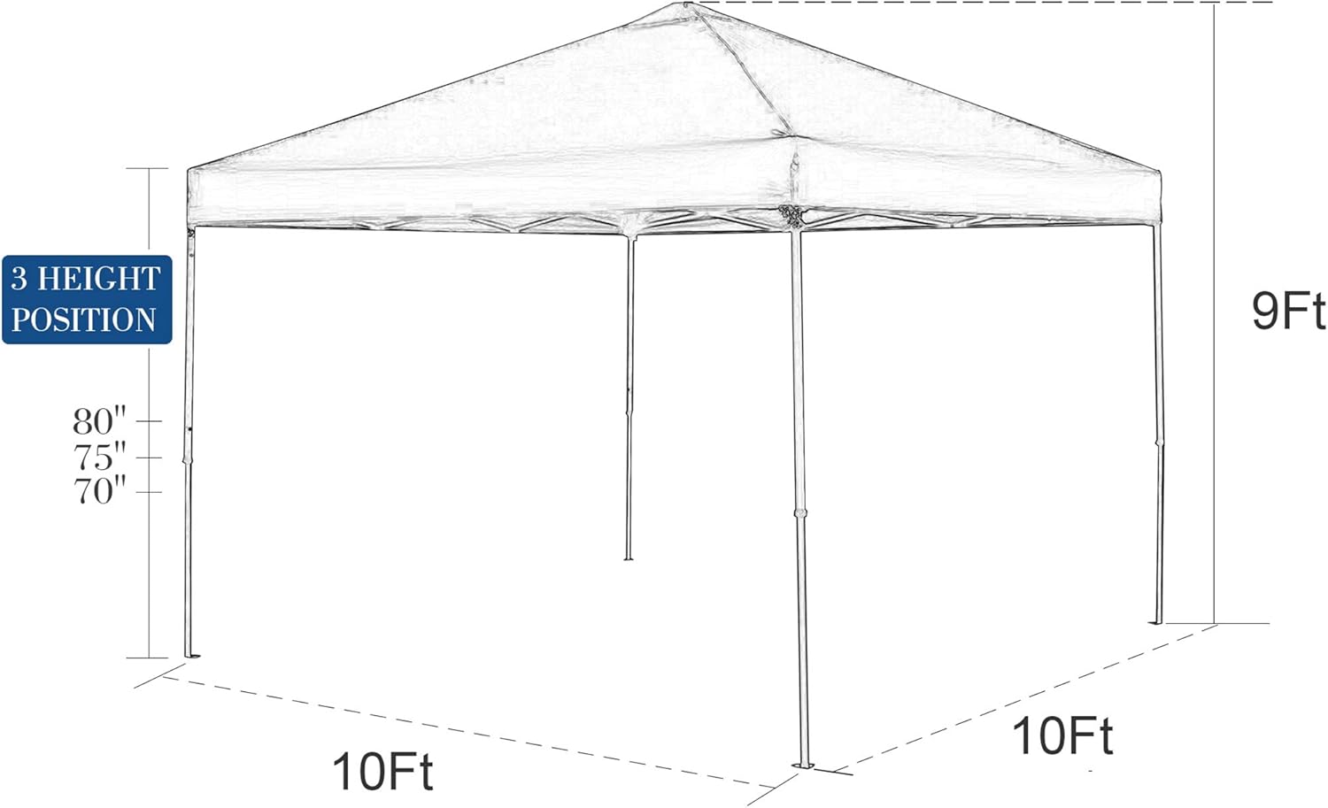 Specification Type: Fold-able Gazebo Canopy Dimensions: 10 x 10 Feet Peak Height: 9 Feet (adjustable) Frame: Powder coated Fabric: 300 D oxford, UV protected, water resistant Roller Bag Material: 600 D Oxford 3 Height Adjustments: 70”, 75”, 80” Package Dimensions: 59” x 7” x 7”