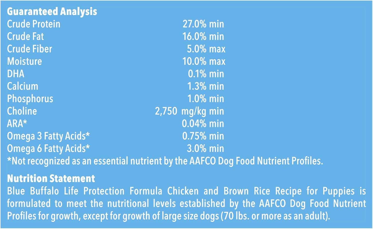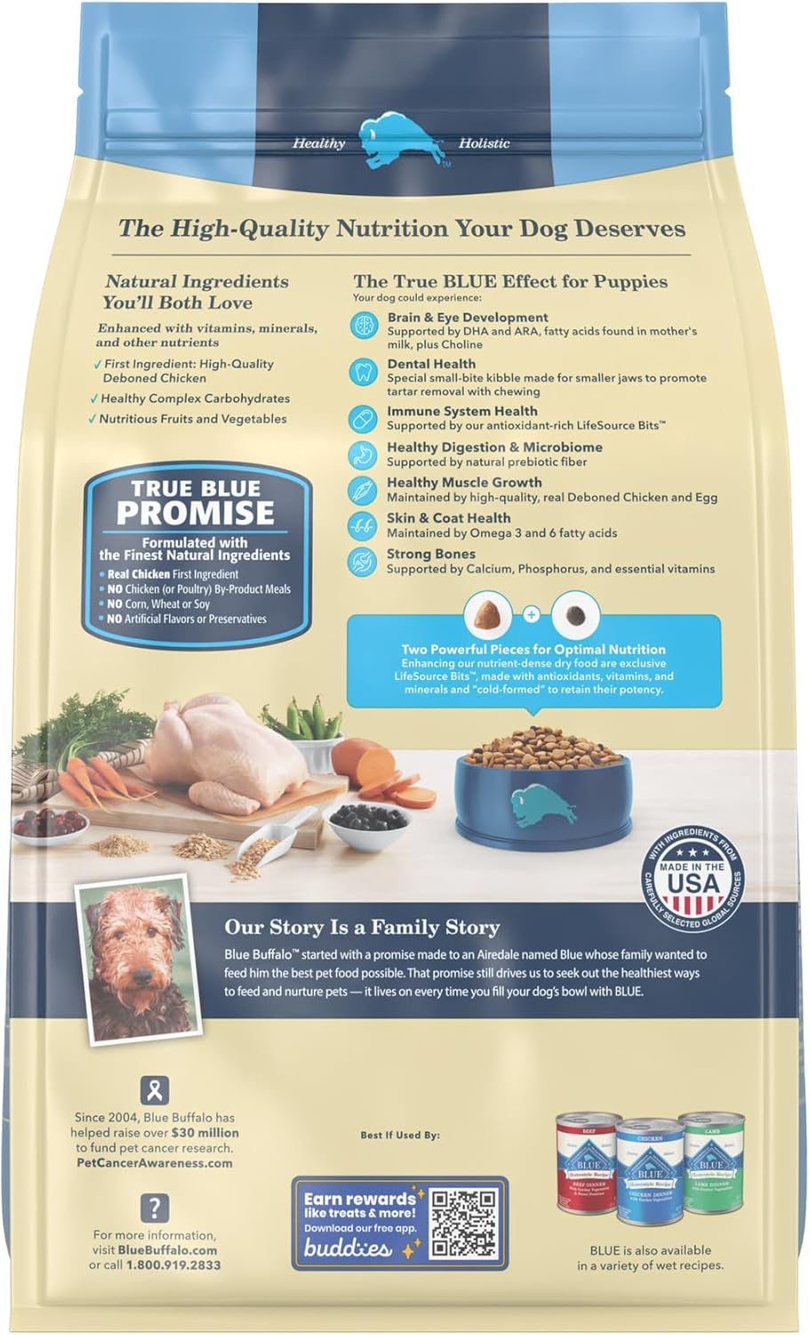 Because puppyhood is such an important stage in any dog’s life, BLUE Life Protection Formula Chicken and Brown Rice Puppy dry dog food is specially made to support the healthy growth and development of your puppy. It’s a high-quality, balanced recipe you can both feel great about. With real chicken first in a lineup of natural ingredients enhanced with vitamins, minerals, and other nutrients, this recipe is as delicious as it is healthy for your new best friend. Formulated specifically for puppies, this diet contains DHA and ARA — fatty acids found in mother’s milk — plus Choline, to support brain and eye development. Like all BLUE dry foods, BLUE Life Protection Formula includes exclusive antioxidant-rich LifeSource Bits, which are “cold-formed” to retain their potency.Give your puppy the balanced nutrition of BLUE Life Protection Formula today.BLUE Life Protection Formula is brought to you by Blue Buffalo, the leader in natural pet food. Blue Buffalo makes premium-quality pet foods featuring real meat, fruit, and vegetables. Love them like family. Feed them like family.