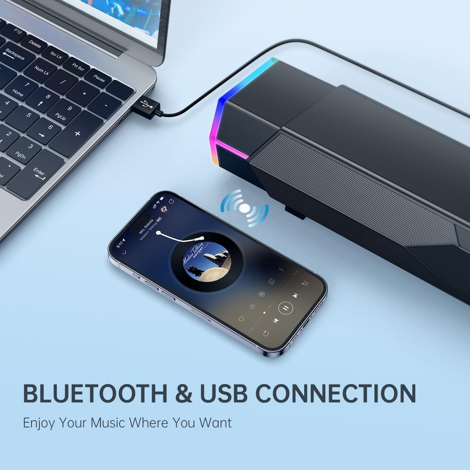 Bluetooth Computer Speakers, PC Gaming Speaker Soundbar, Wired USB Powered Monitor Speaker, Colorful RGB Lights with Switch Button, 12W, Black(2024 Upgraded)