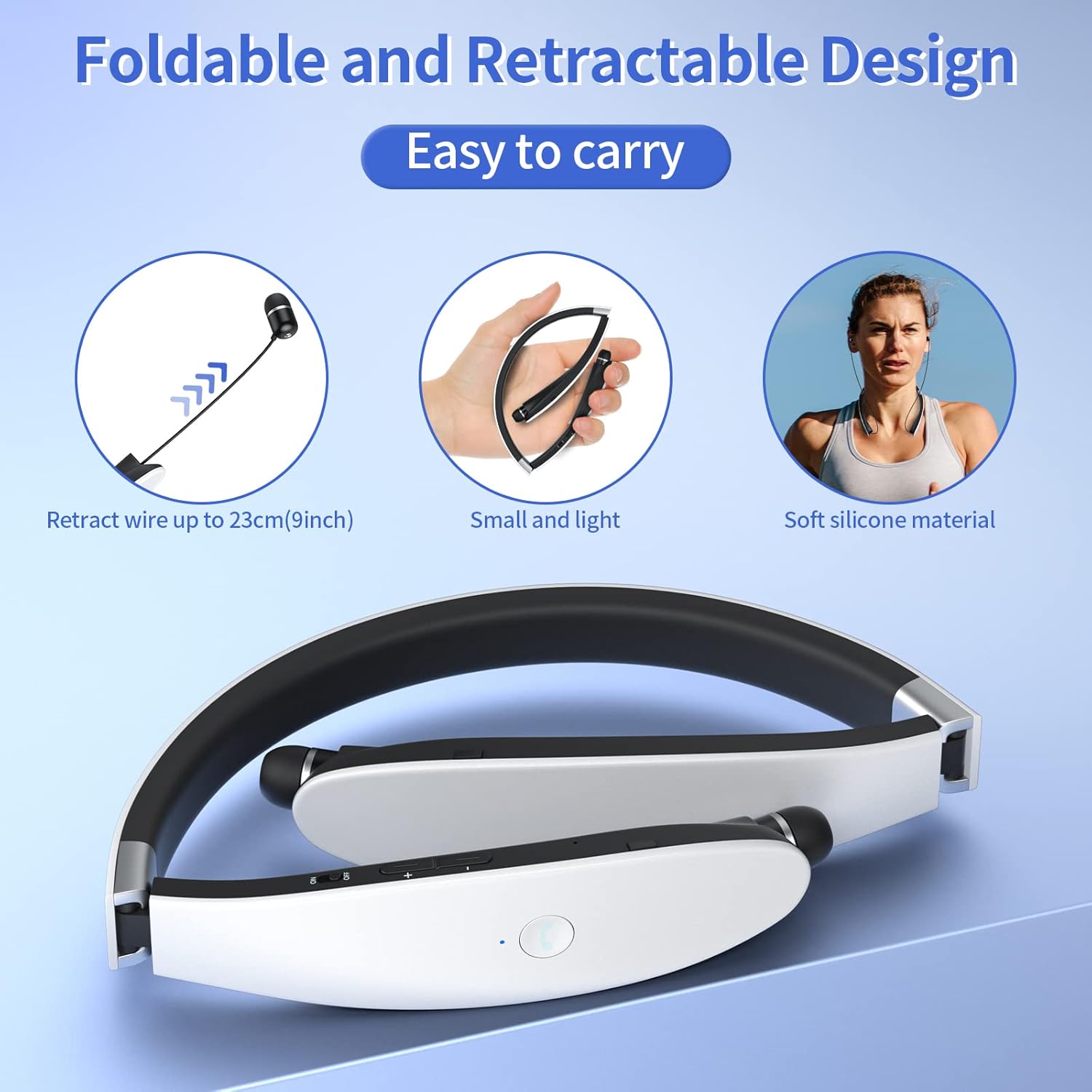 Bluetooth Headphones, Neckband Wireless Bluetooth Headset with Retractable Earbuds and Carrying Case, Foldable Noise Cancelling Earphones with Mic for Workout, Sweatproof & Lightweight (White)