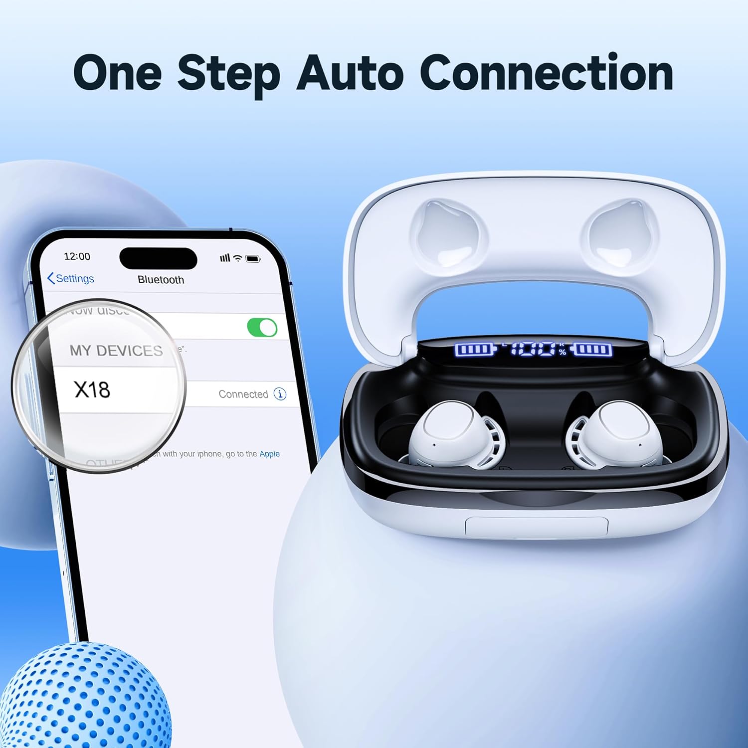 Bluetooth 5.3 and Auto Connection: With the latest bluetooth 5.3 technology, our X18 wireless earbuds swiftly and reliably transmit device signals, ensuring seamless music playback and call quality without any delay or signal degradation.Our X18 bluetooth wireless earphones are designed with a hall switch, enabling automatic connection when the case is opened. Once initially connected, both earbuds will remember your device and automatically reconnect when the case is opened again