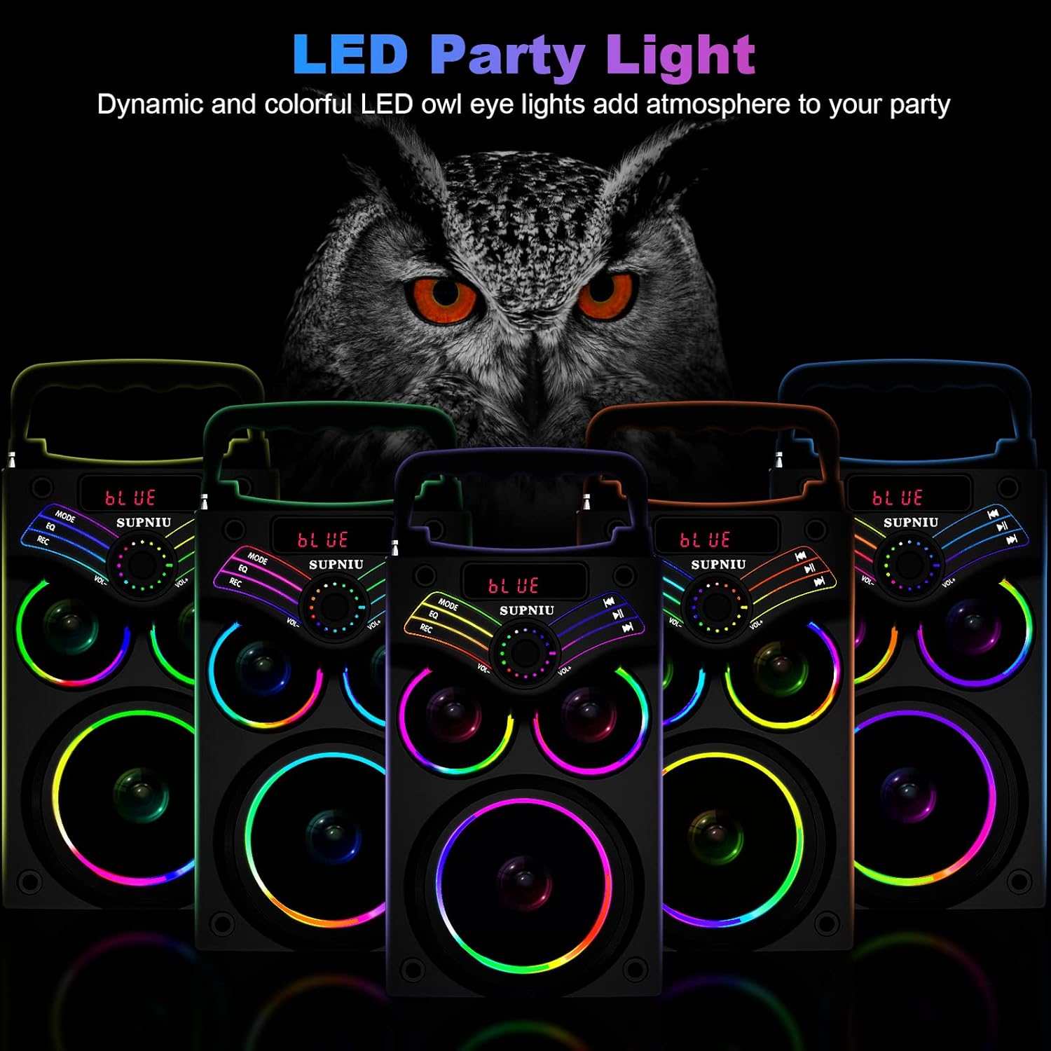 The speaker cabinet uses MDF, so that the speaker in the sound is the maximum to maintain their own non-resonance. Make the sound sound more clean and clear.Bluetooth 5.0 capable of guaranteeing uninterrupted connectivity at a Bluetooth range of 100 feet.Long battery life of 4000mAh for 9-12 hours of continuous playback. (depending on the volume played and the type of song)Portable karaoke machine, just plug in your microphone and you can sing karaoke anytime, anywhere.Personalized cool LED owl light show.