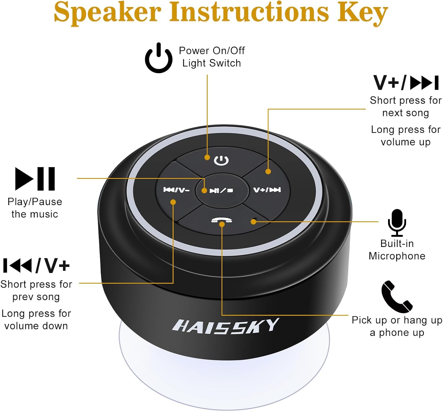 Bluetooth Waterproof Shower Speaker, Portable Wireless Speaker with Suction Cup Small Speaker with Colorful Lights, Teen Gift Ideas, for Shower, Bathroom, Pool, Beach