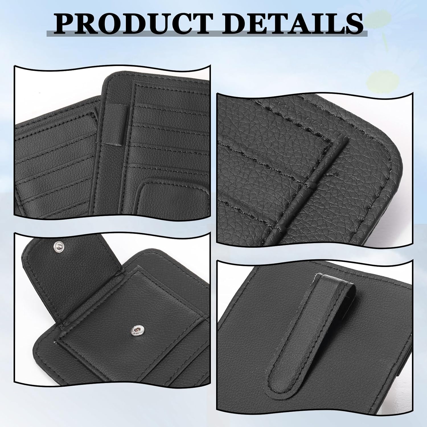 Provide Convenient Storage: mainly made of quality PU, the car visor pocket organizer is reliable to hold small car interior accessories; The 2 grain textured elastic straps effectively prevent sliding for more snugly and stable storage, making storage more convenient