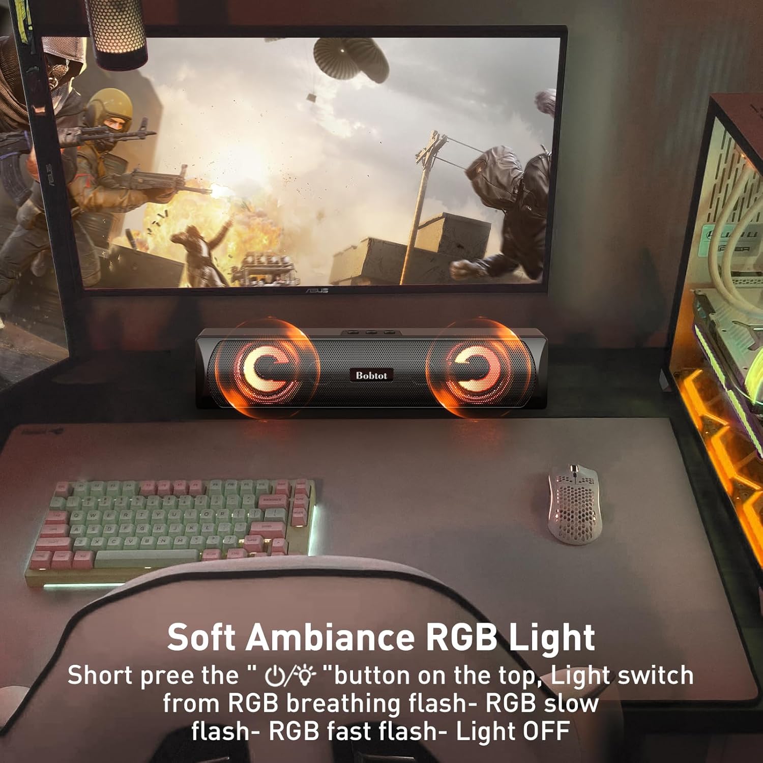 Bobtot Computer Speakers Desktop Soundbar – HiFi Stereo Audio RGB Mini Sound Bar External Speaker with Bluetooth AUX-in Wired USB Powered Volume Control for PC Laptop Tablets Monitor