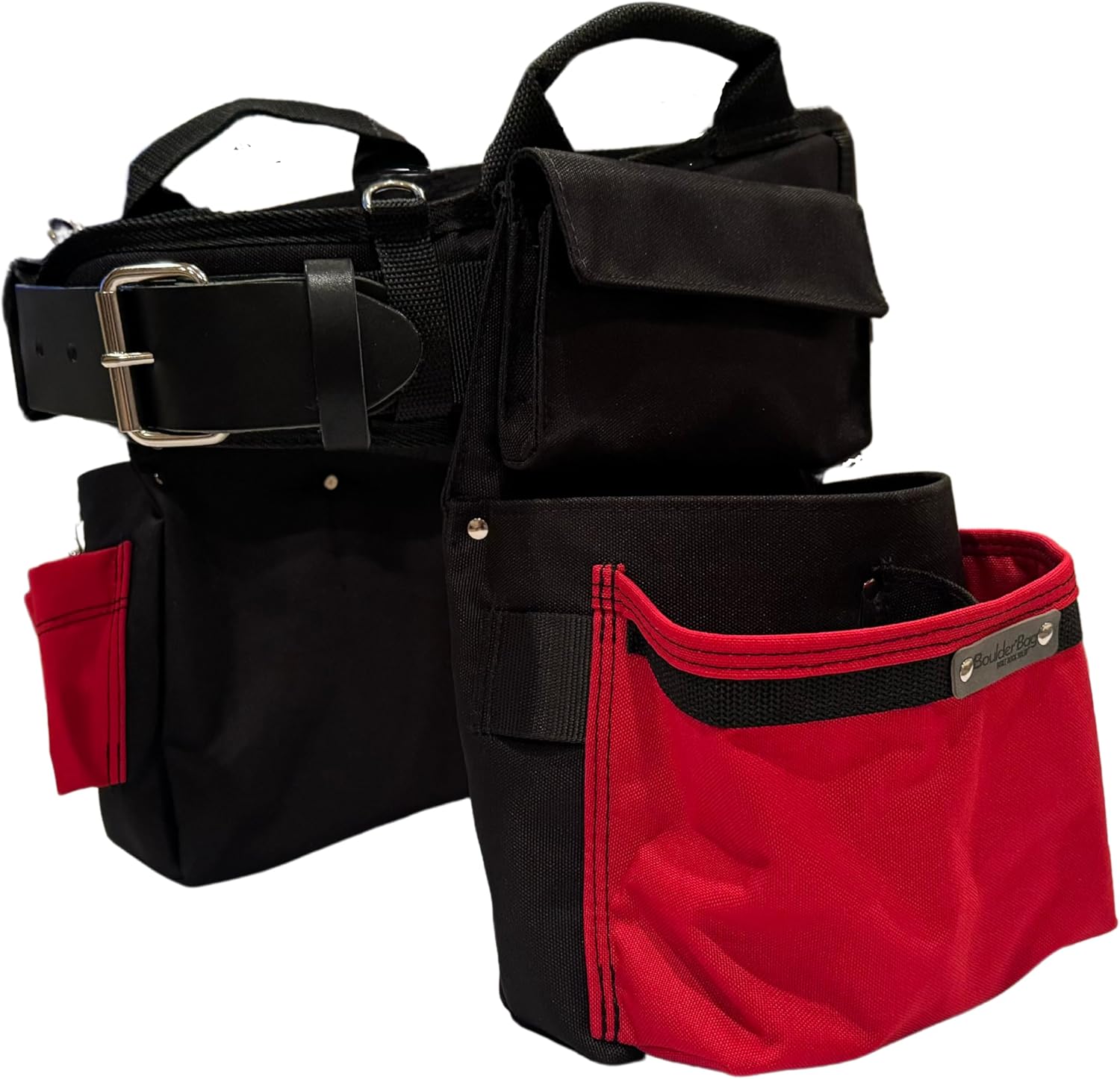 BOULDER BAG Ultimate Electrician’s MAX Combo with Comfort Back Support Tool Belt, Leather Belt Buckle, Heavy Duty, Red, (Large 36-40 Inch Waist), Made in USA