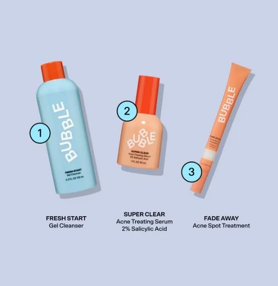 Fear no pimple with the Bubble Acne Kit! Fresh Start Gel Cleanser clears pores gently, Super Clear Blemish Prevention Serum fights acne, and Fade Away Spot Treatment calms inflamed acne with Benzoyl Peroxide.