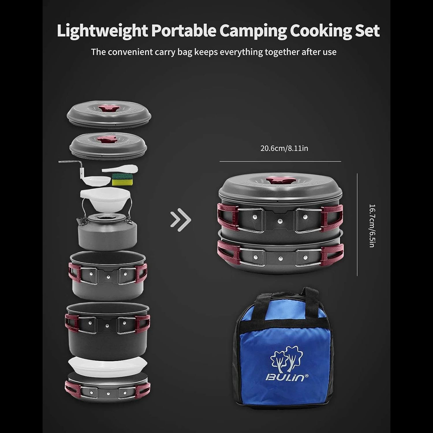 Bulin 13Pcs Camping Cookware Mess Kit, Nonstick Backpacking Cooking Set, Outdoor Cook Gear for Family Hiking, Picnic Lightweight Cookware Sets(Kettle, Pots, Frying Pan, BPA-Free Bowls, Plates, Spoon)