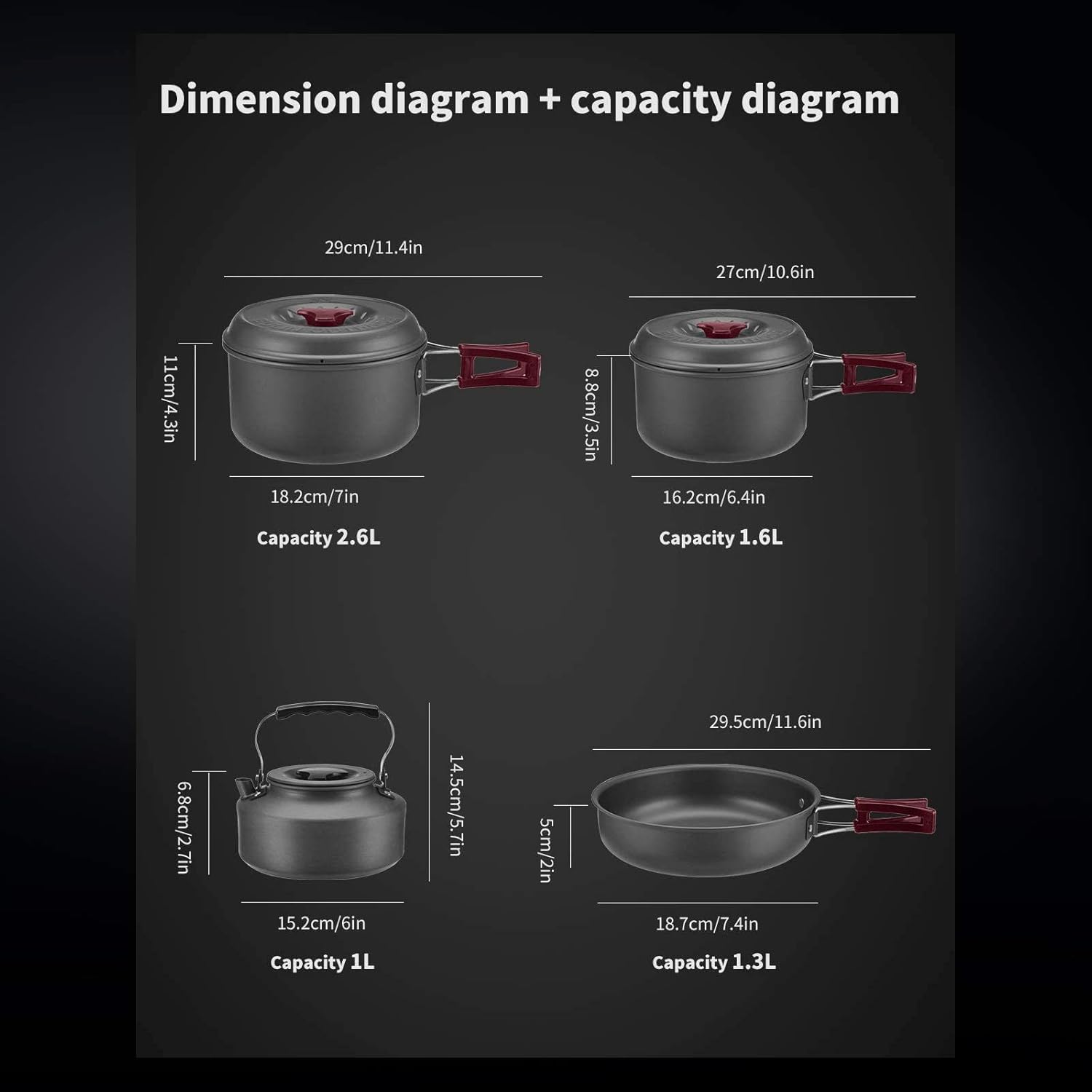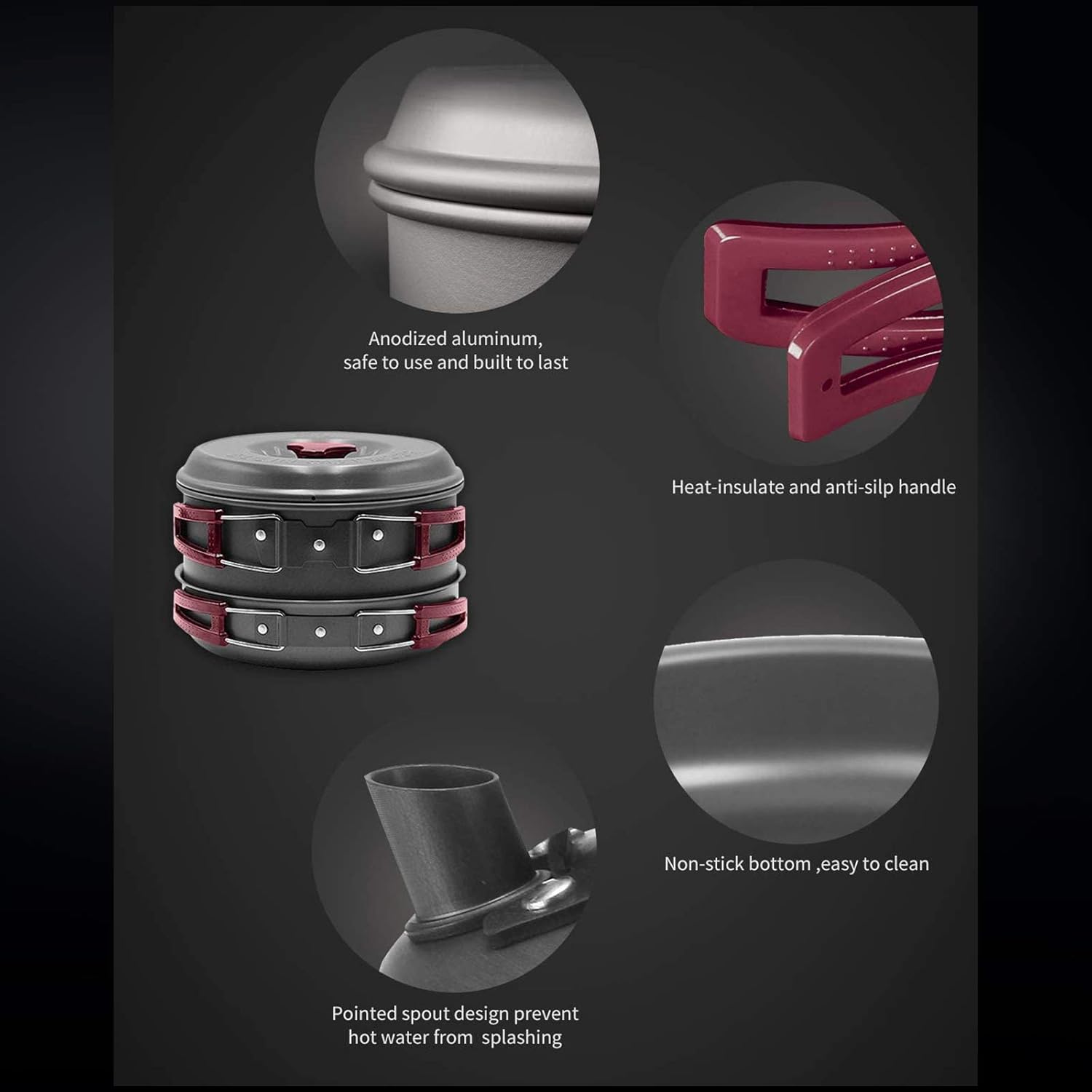 【Food-grade Material】The camping cookware Mess kit is made of safe, non-toxic aluminum with non-stick coating for easy cleaning. Hard-anodized aluminum provides fast heating, high temperature resistant, corrosion-resistant.