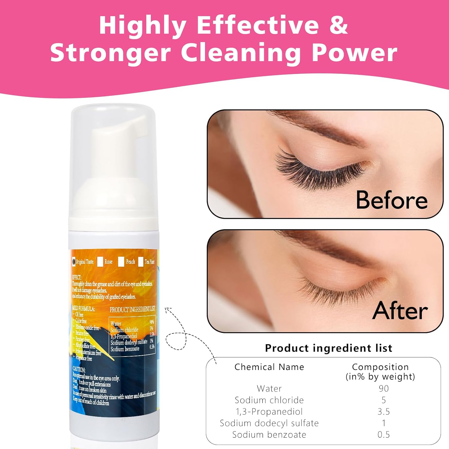 ♦️【Natural Safety Lash Extensions Shampoo】Our eyelash extension lash shampoo is manufactured with Water 90%,Sodium chloride 5%,1,3-Propanediol 3.5%,Sodium dodecyl sulfate 1%,Sodium benzoate 0.5%.No pigment,no color,no stimulation,no mineral oil,no paraben,no alcohol,no polyquaternium.Buqikma lash shampoo can thoroughly clean tne grease and dirt of the eyelashes.This eyelash shampoo will not damage eyelashes,and enhance the durability of grafted eyelashes.