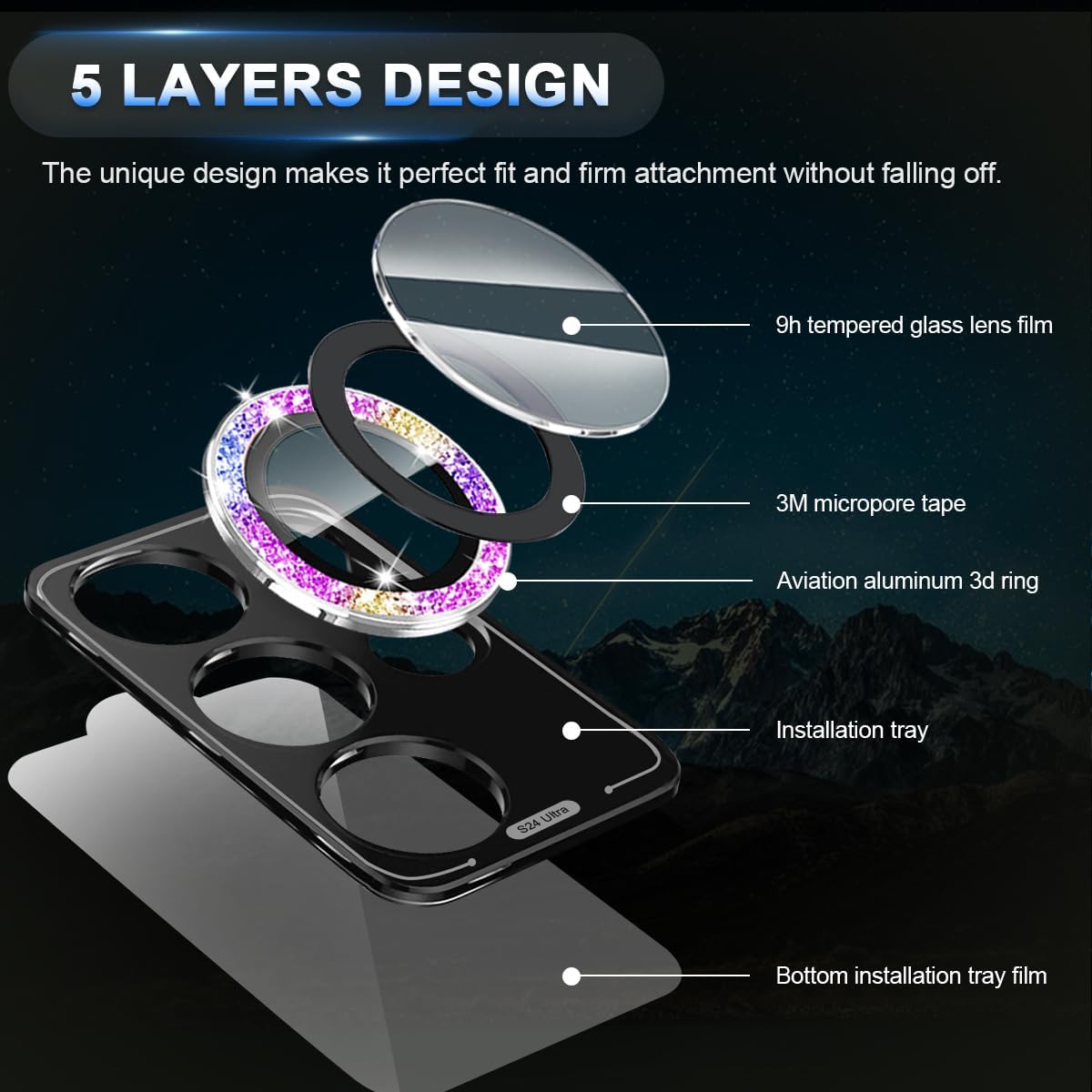 Camera Lens Protector for Samsung Galaxy S24 Ultra, Tempered Glass Aluminum Alloy Ring Lens Cover with [Installation Tray] [Removal tool] Fit for Samsung Galaxy S24 Ultra(Glitter Colorful)