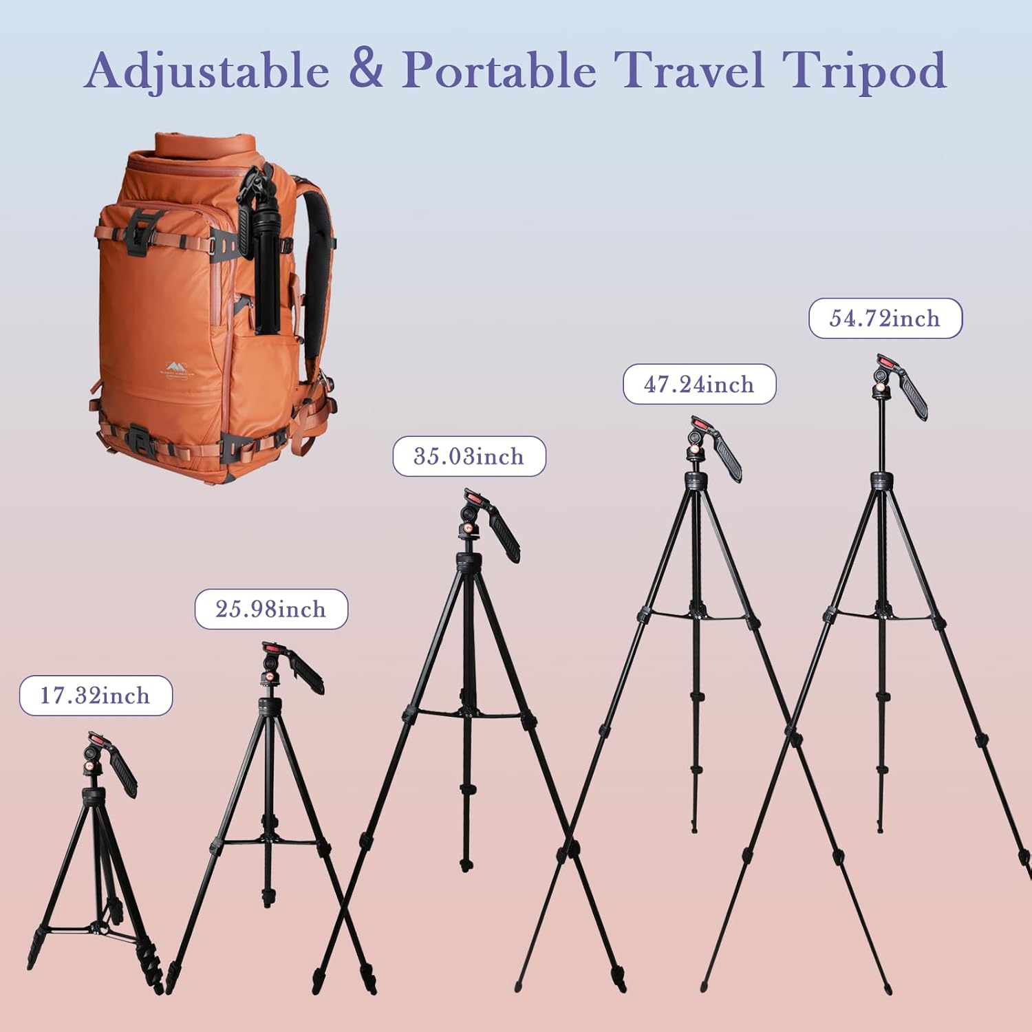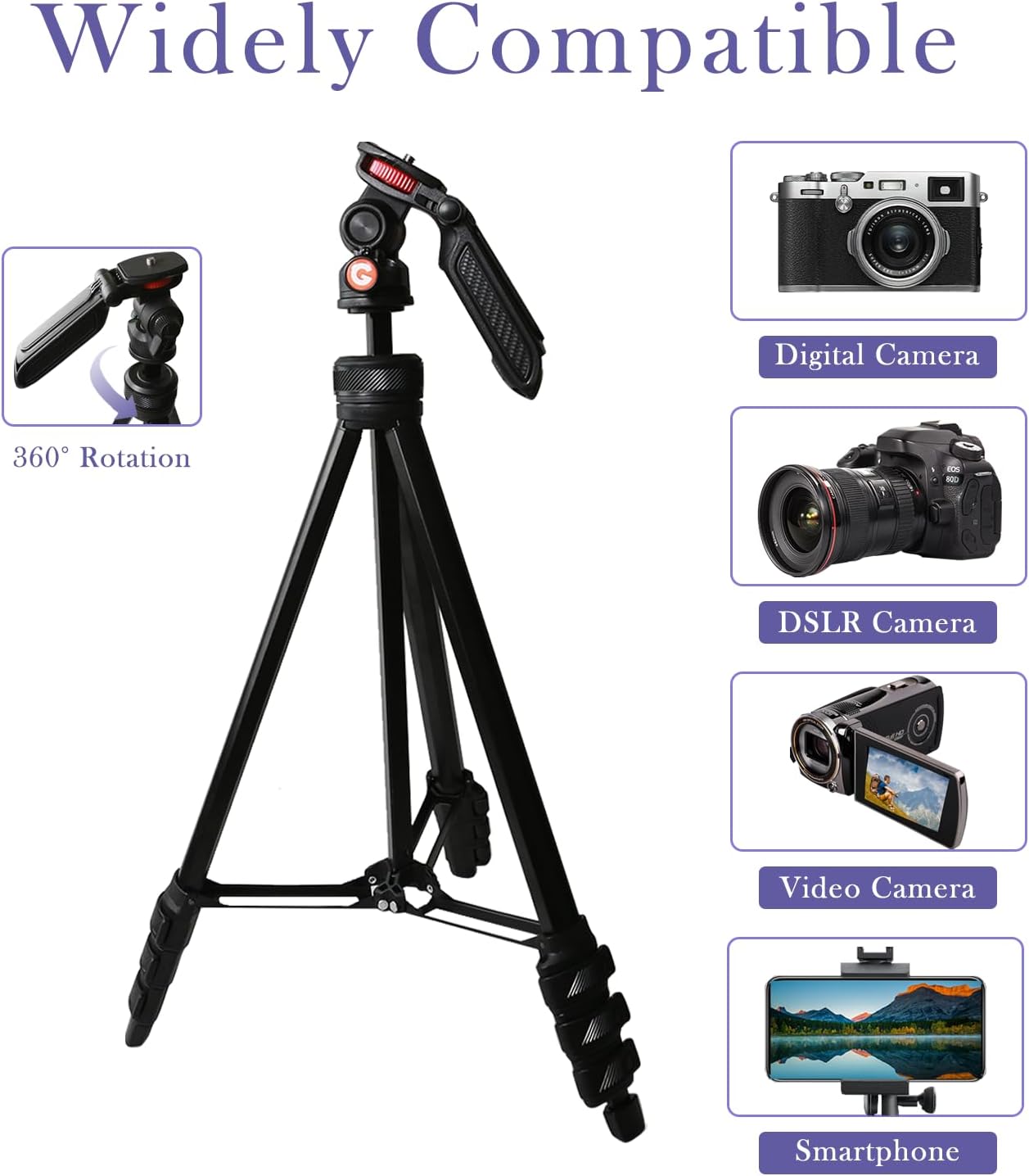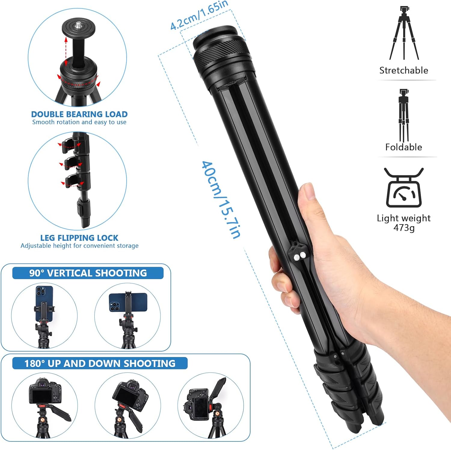【Extendable Tripods】Extends from 20 to 60in with 5-section aluminum alloy telescopic rod, this camera tripod fully adapts to a range of different heights with the locking-pad locked, and enables you to create your own unique height and view while taking a picture or video.