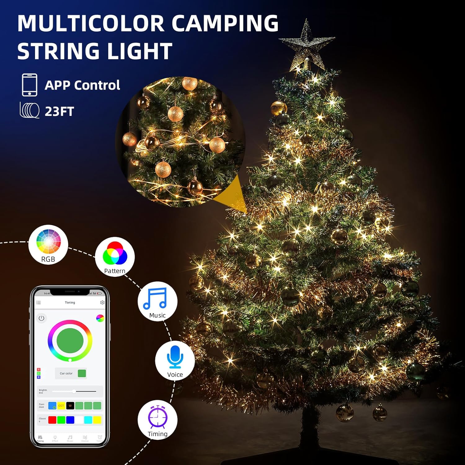 Camping String Light, Outdoor String Lights, 23FT Rechargeable RGB Multi-Color Waterproof Hanging Light with App Control, Portable LED Tent Light for Holiday Camping Party Festival