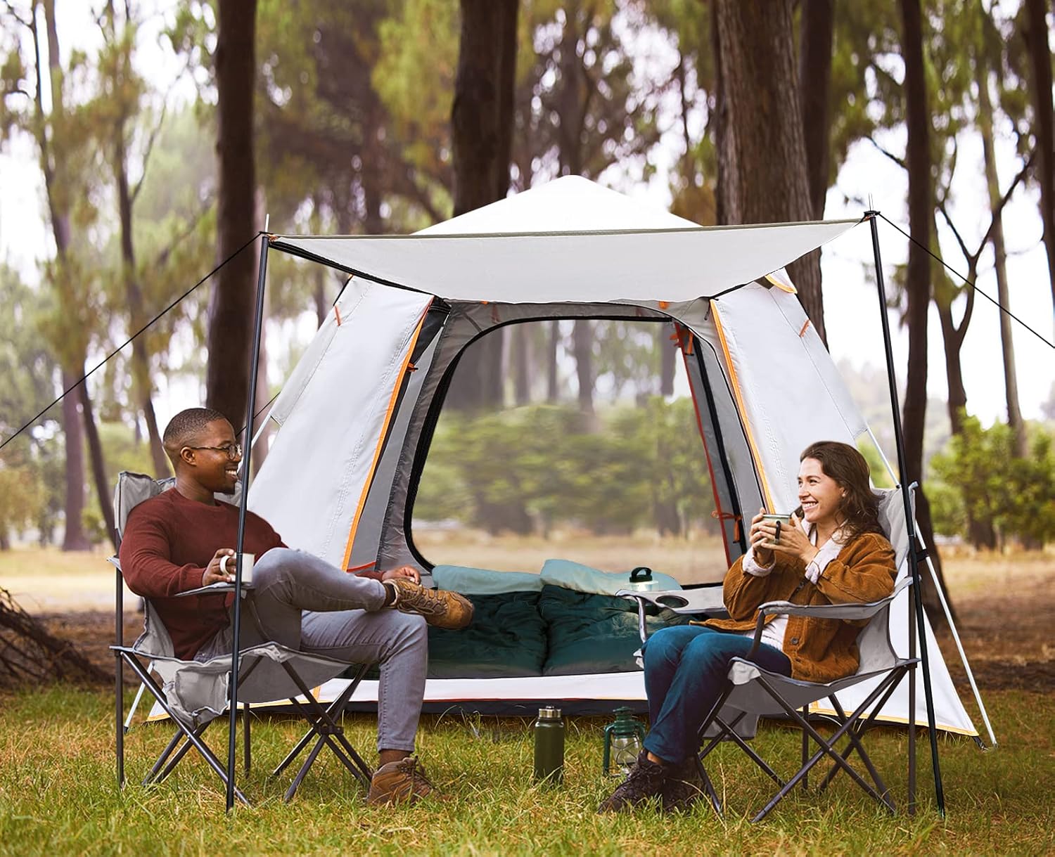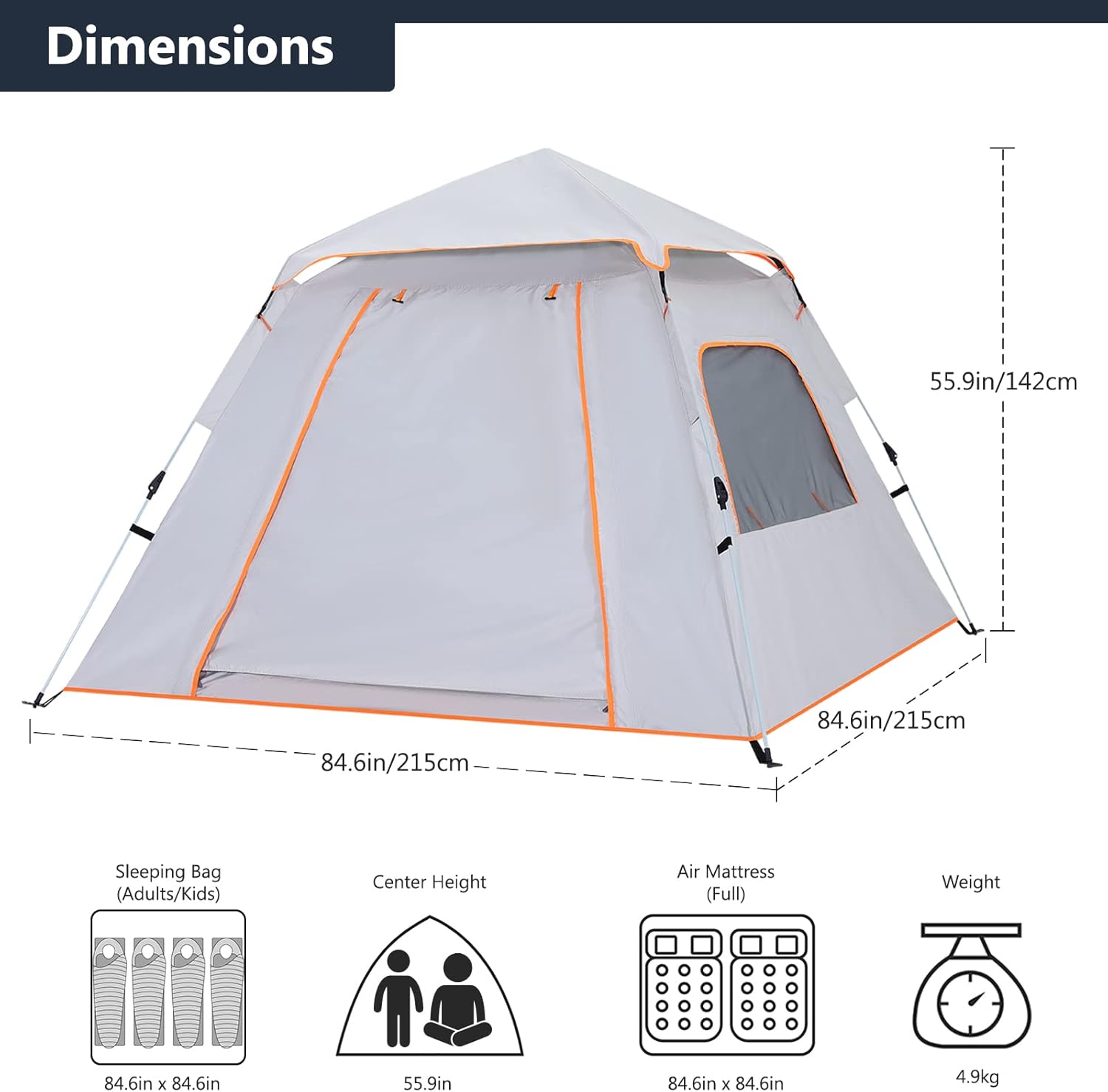 【Roomy 4-person Tent】: Unfold size 85(L)x85(W)x60(H)inch, Weigh: 10LB. It can be stored in to the 30x7x8inch carry bag. Enough space and easy to carry. Our tent foyer can be opened for use as a pergola, enjoying a large area of shade space.