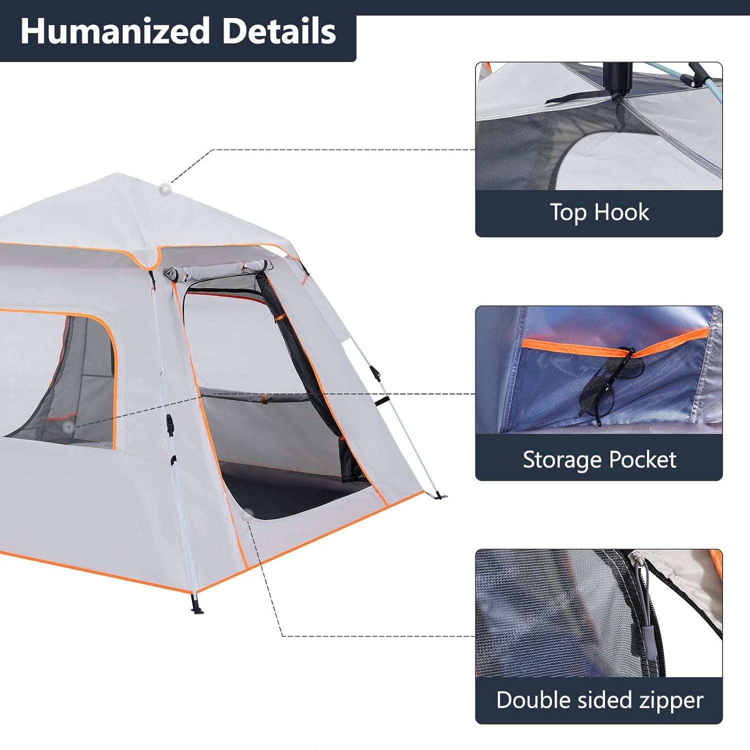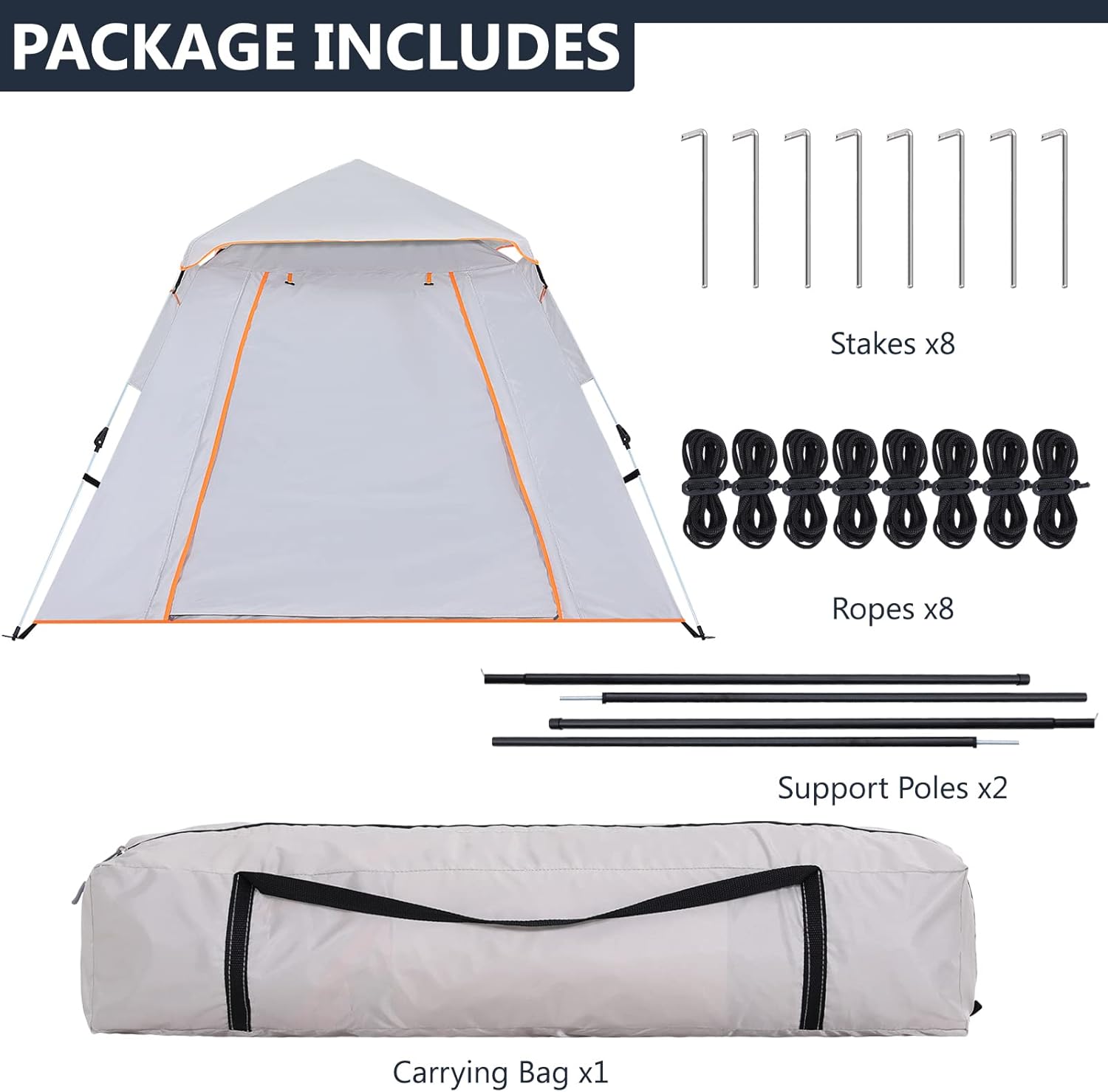 【Stable & Durable】:The camping tent is made of high-quality 210D Oxford Fabric, PU 2000mm with waterproof function, equipped with 8 ropes and 8 stakes for more safe and stable. Additional 4 Support poles and removable Rain Fly.