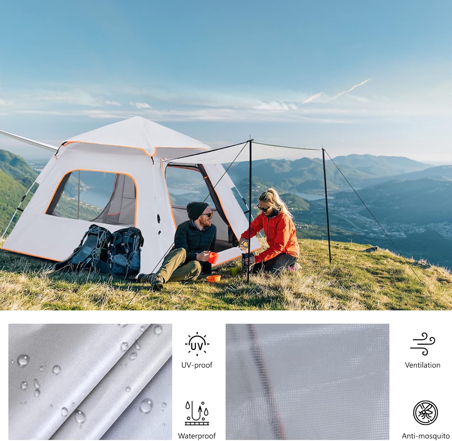 【Perfect Ventilation】:Skylight net and larger mesh window designed enhances breathability and comfortable. And keep the bugs and mosquitoes away that you and family can freely and comfortably stay in tent. A mesh design on the tent top gives you a romantic night to see stars and maintain fresh air goes into the tent.