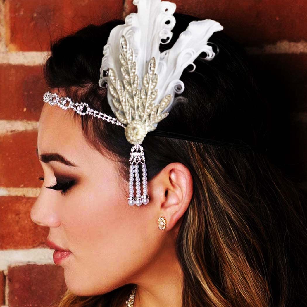 CASDRE Vintage White Feather Headband Pearl 1920s Headpieces Crystal 20s Hair Accessories for Women and Girls