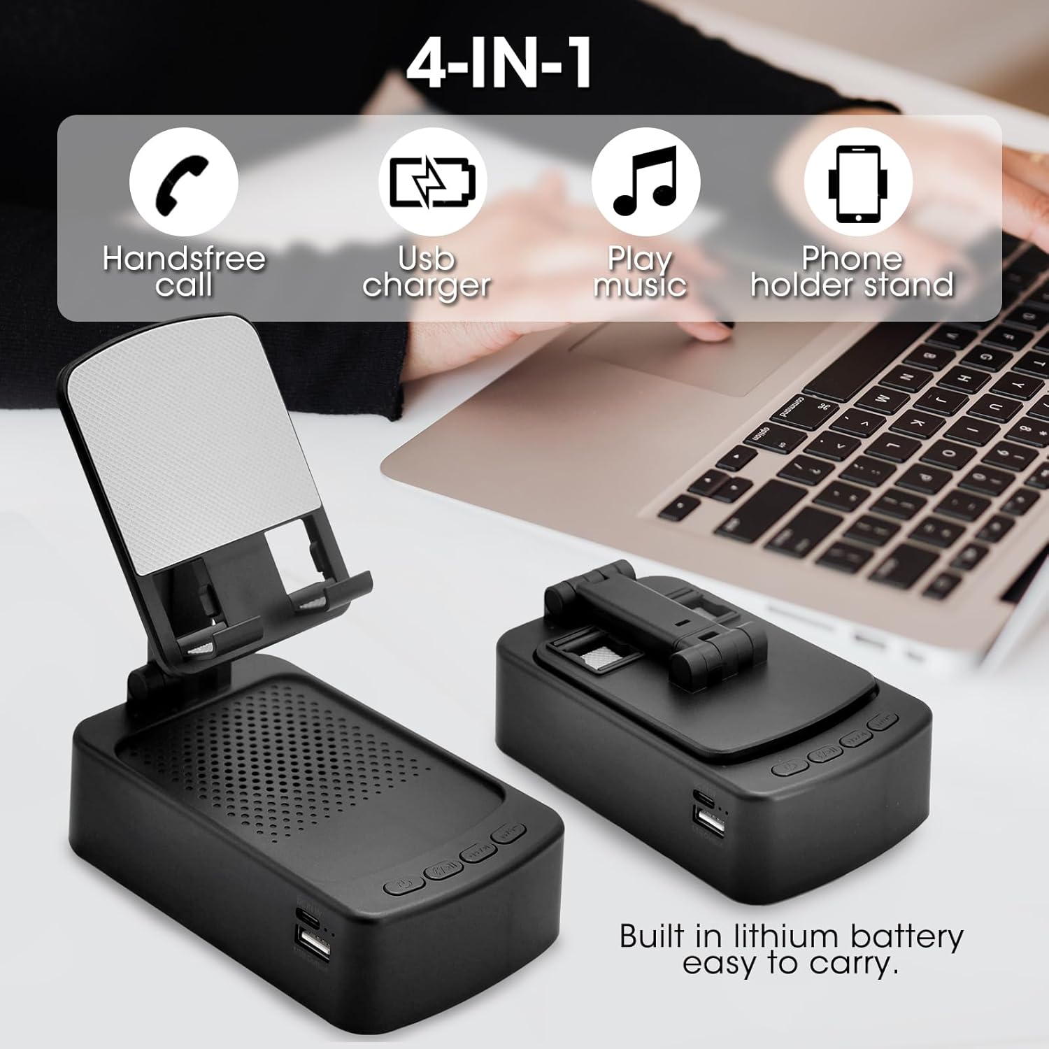 4 IN 1 DESIGN: This device combines four functions of adjustable cell phone stand, HD Bluetooth speaker, USB power station and microphone in one, perfect for video calling, e-learning, watching videos and more.