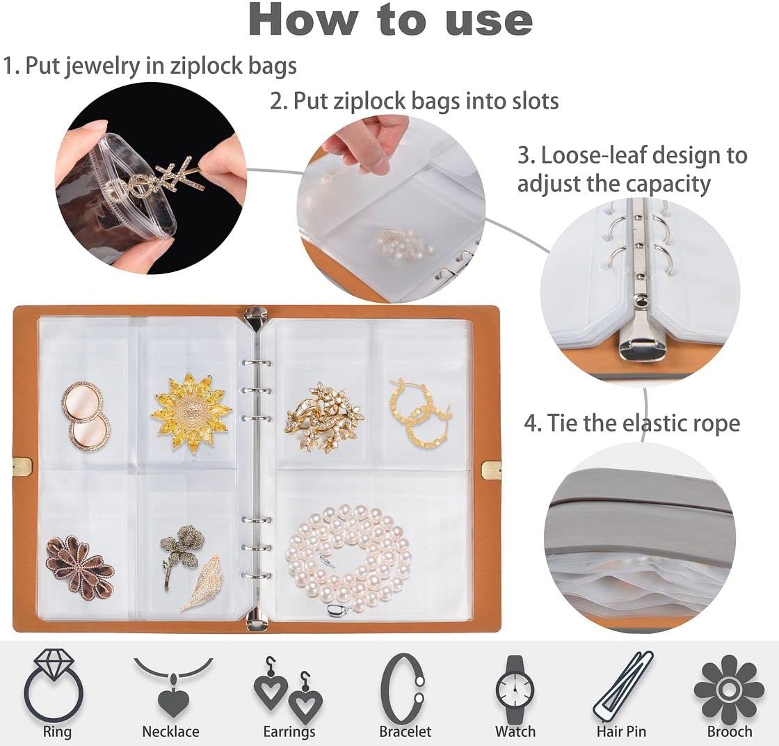 💎Jewelry Organizer Book – PU leather loose-leaf book comes with metal binder rings, this book/album design makes your jewelry easy to collect and display. Just put your accessories into these thicken self-sealing PVC bags, then stock them in the pockets of the album. Transparent PVC zipper bag, anti-tarnish, anti oxidation, and dust-proof