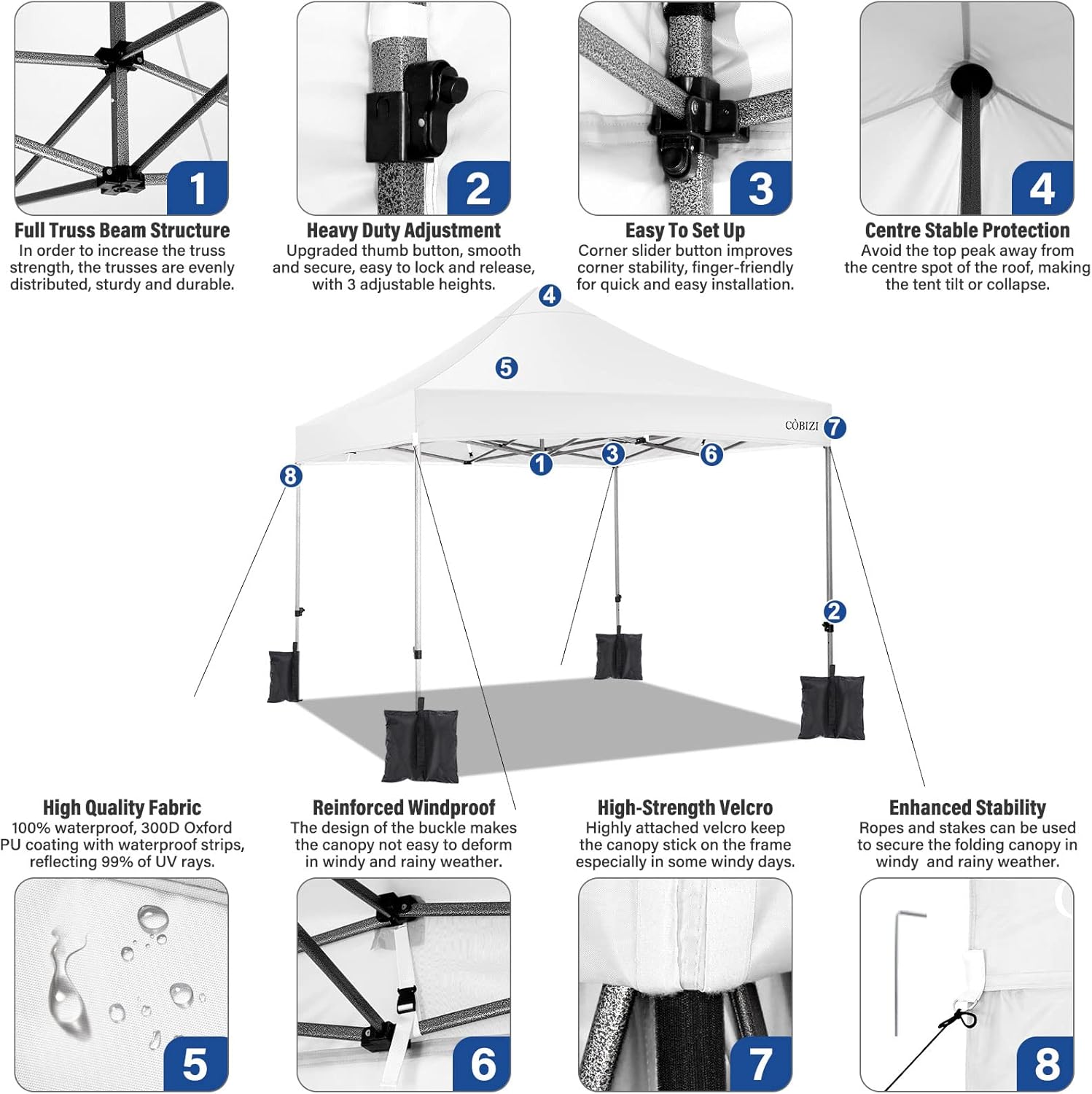 Be the first to review “COBIZI 10×10 Pop Up Canopy Tent with 4 sidewalls Commercial Heavy Duty Canopy UPF 50+ All Weather Waterproof Outdoor Canopy Wedding Tents for Parties Gazebo with Roller Bag, White (Windproof Upgraded)”