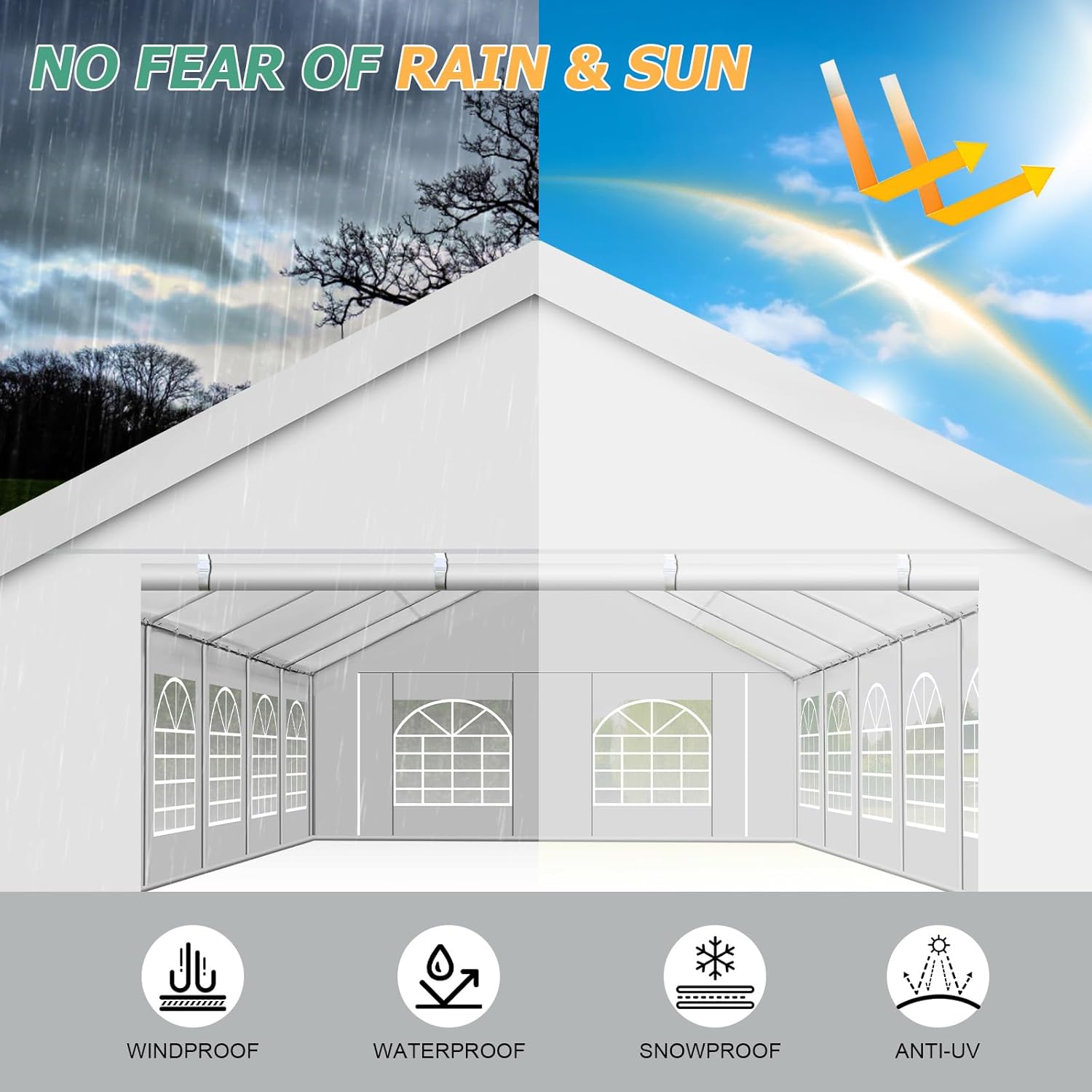 💯💯【Premium Construction Material】Top cover of our white tent is made of 160g imported PE fabric, providing waterproof and UV protection.Our 20×40 Heavy Duty Canopy Tent is designed with 6 removable sidewalls and 2 zippered doors with chapel-designed windows that provide excellent cross ventilation and airflow, ensuring you have a cool and comfortable experience. Removable sidewalls also help you make special conditions for different occassions.