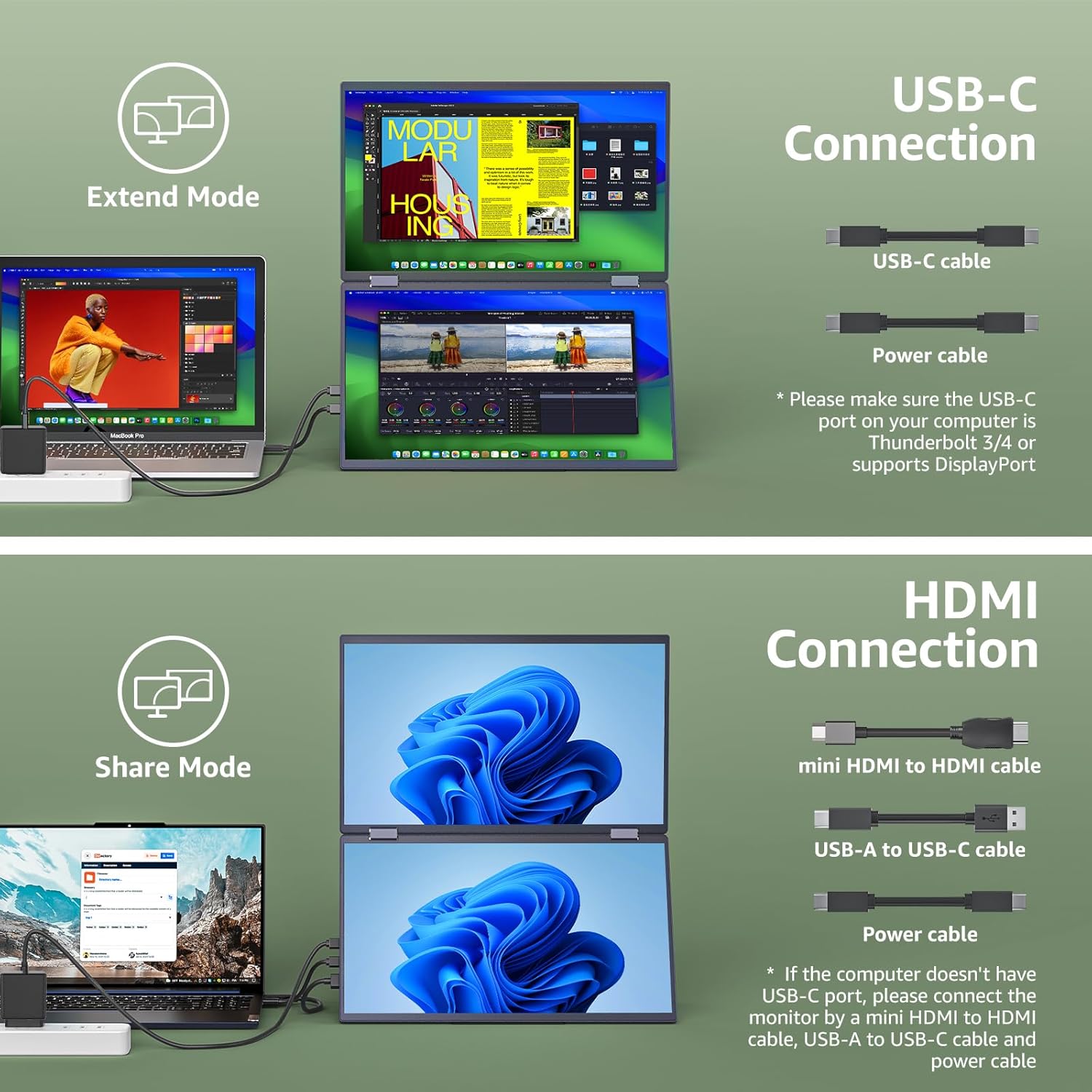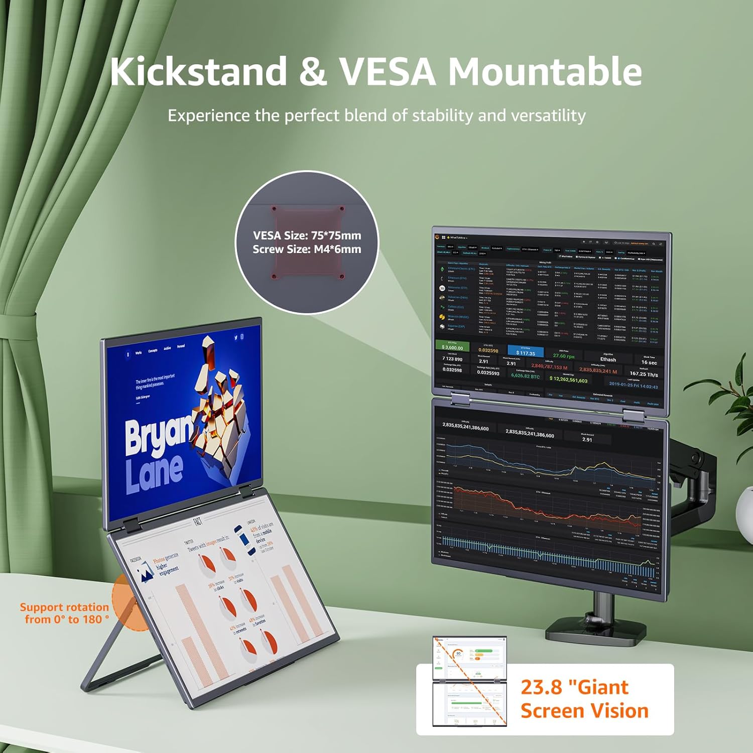 【Integrated kickstand and VESA Compatibility】 Customize the position and angle of the monitor with the 180° adjustable Integrated Kickstand. This dual screen monitor also with 4 VESA holes can be easily and stably mounted on a stand for high productivity and less space. Share your screen with others for a clear view by tilting and folding the portable monitor up to 315 degrees.