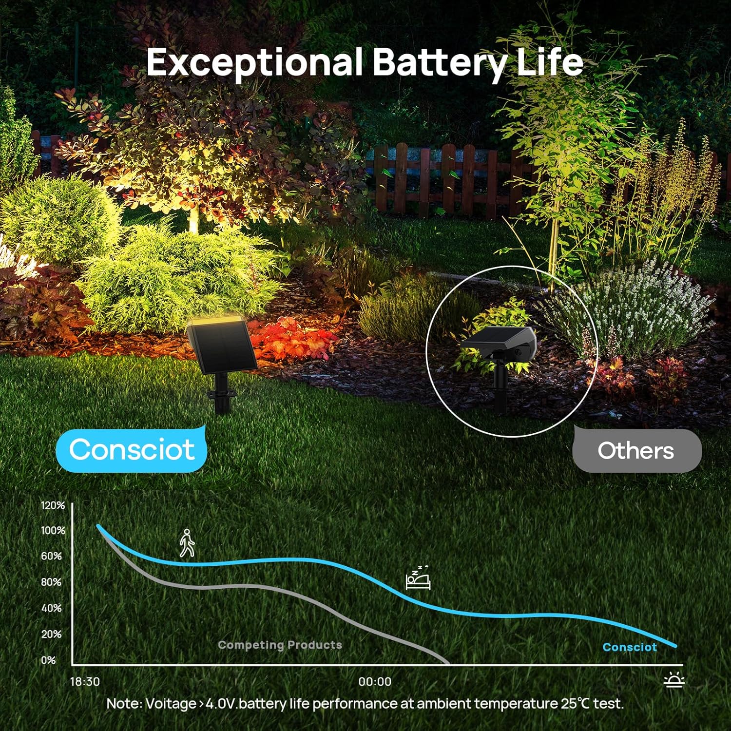 [Ultra-Brightness & Explore Endless Nights] Consciot solar spot lights outdoor are equipped with 24 High Performance LED beads, providing clearer, more even, and brighter light. With a unique 90° beam angle, it forms a focused spotlight for better visual effects. Ideal for illuminating yards, gardens, pathways, driveways, pools, decks, porches, decks, fences, walls, and more.