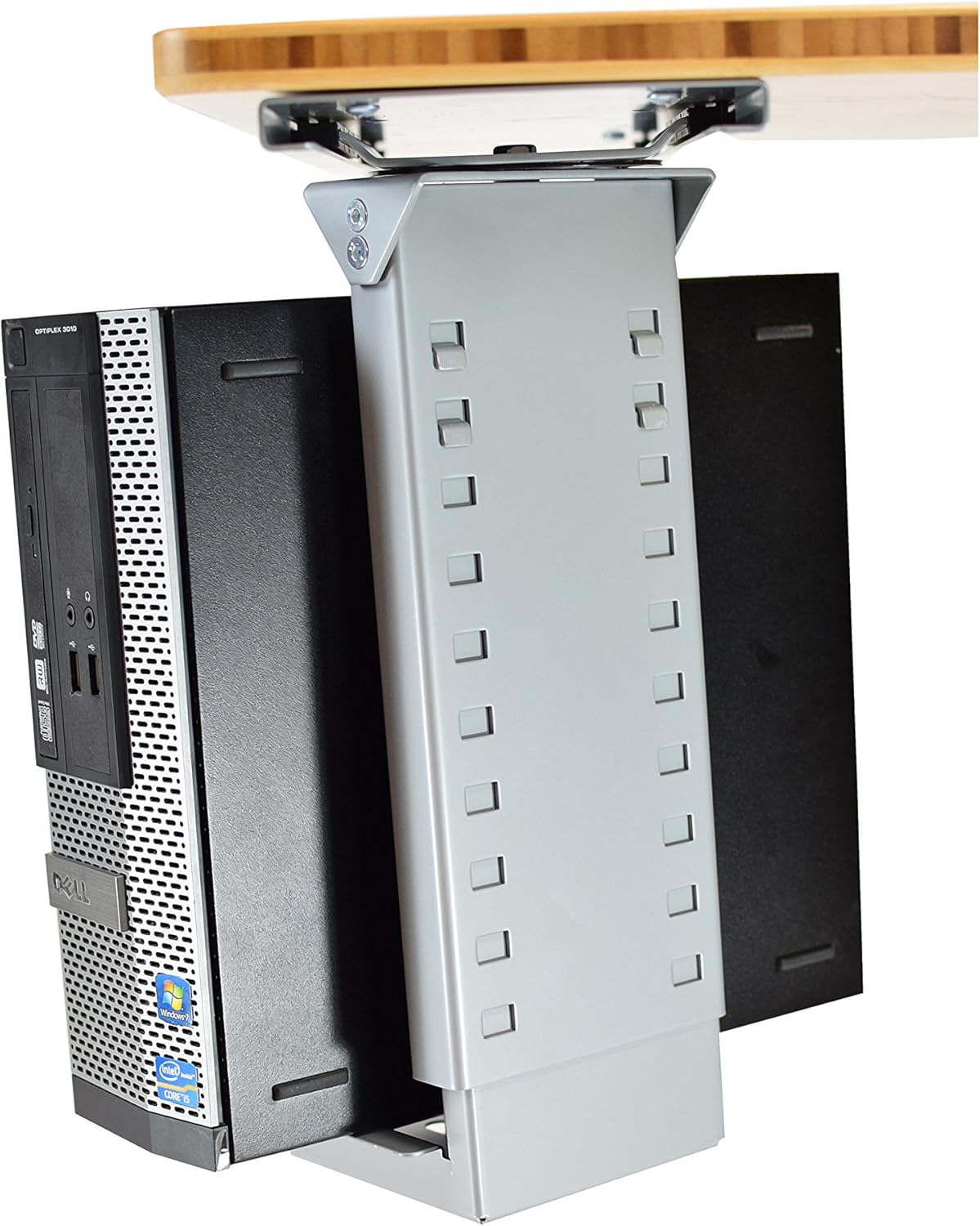 ADJUSTABLE HEIGHT & WIDTH CPU HOLDER: under-desk computer CPU mount has 9 height settings from 13-21″. Width adjusts from 2.63-5.13″ to accommodate a range of cpu sizes