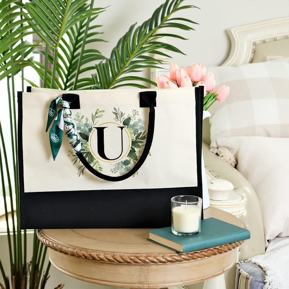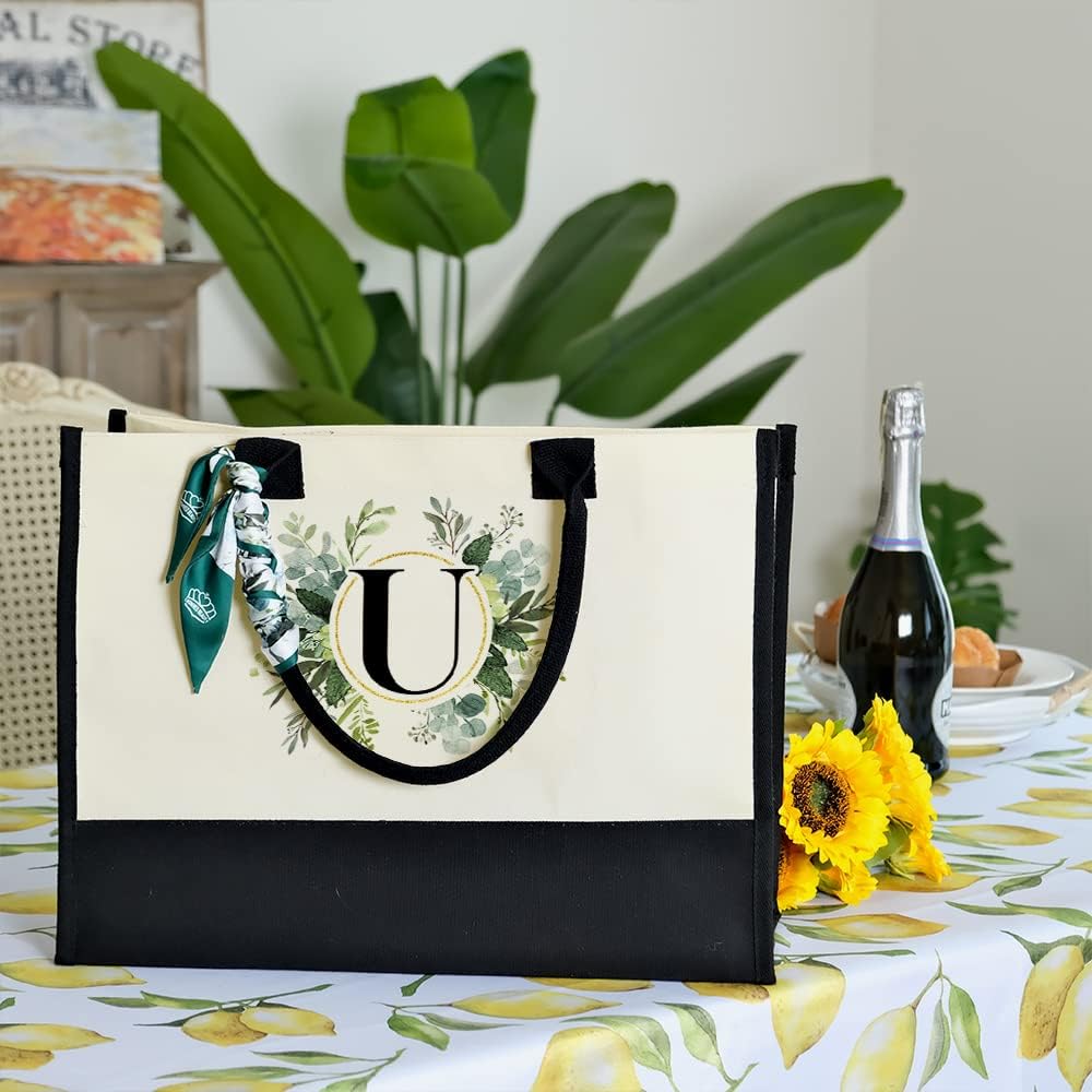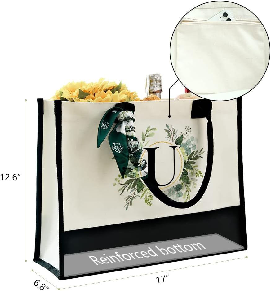 CROWNED BEAUTY Canvas Tote Bag with Zipper Pocket, Personalized Birthday Gift for Women, Floral Initial Letter U Bag for Vacation Beach CT20-U