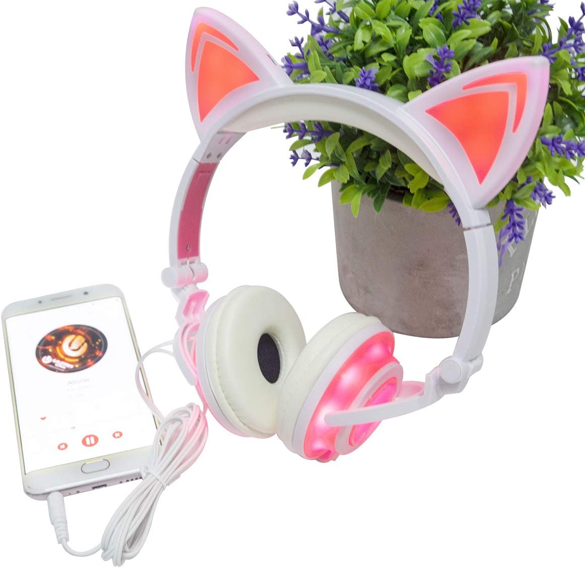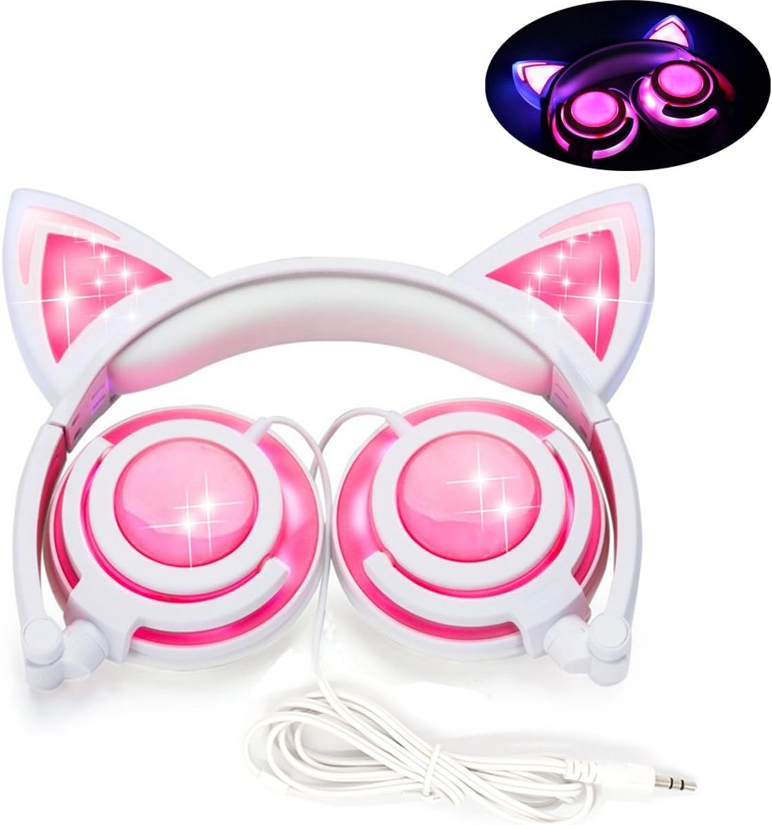 Cute On-Ear Headphones for Girls (4-20 Ages) Foldable Noise Isolating Cat Headphones with Light Up LED Wired Earphones for iPad Tablet PC Computer Mobile Phones Xmas Gift (Pink)