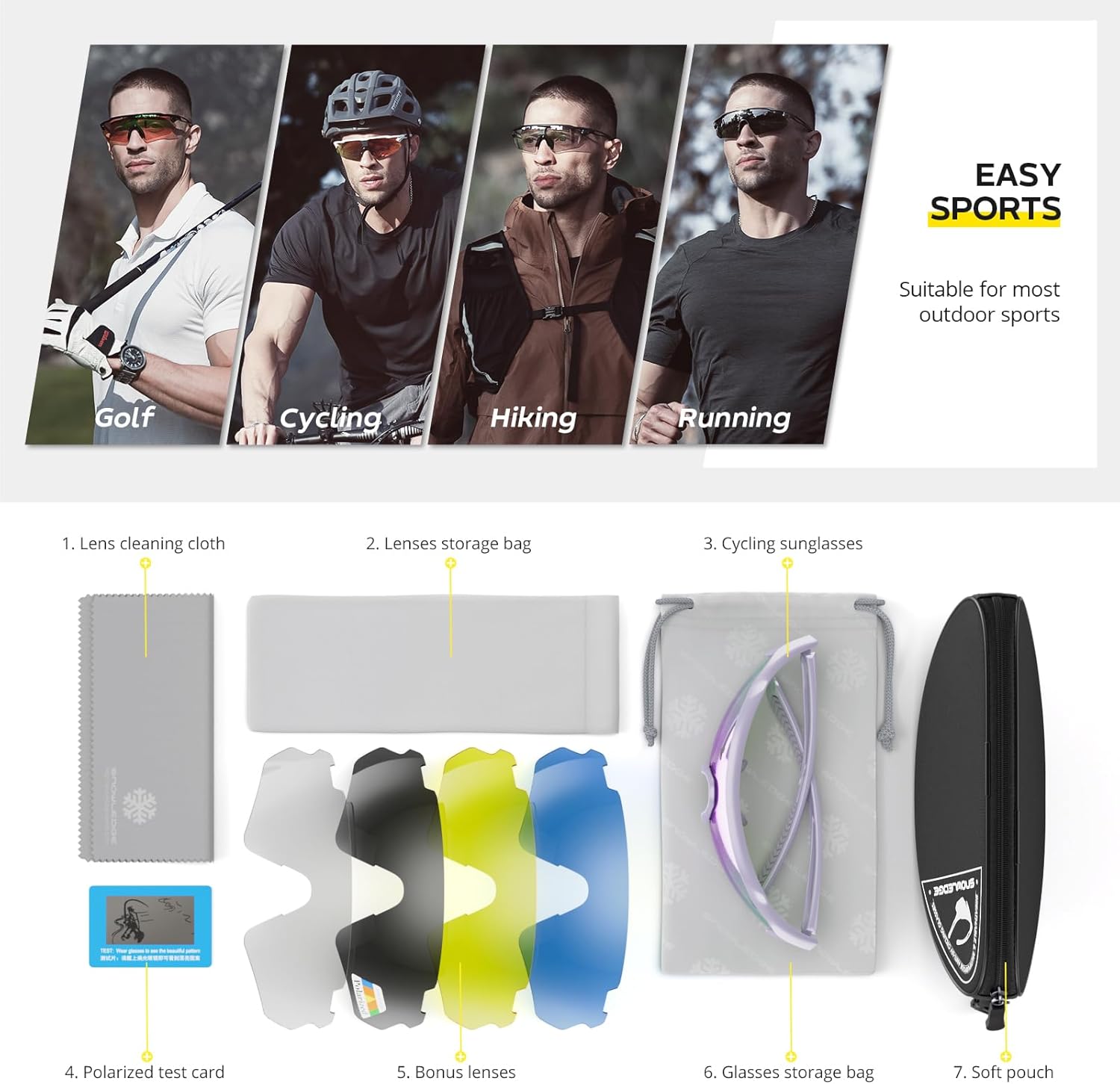 HUBO SPORTS’s sports sunglasses are made of TR90, which is soft, light, impact resistant, scratch resistant, durable and not easily broken.