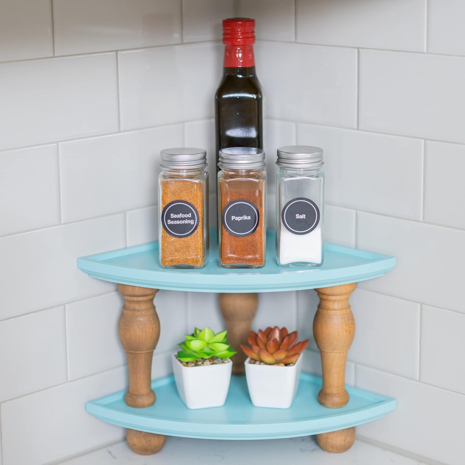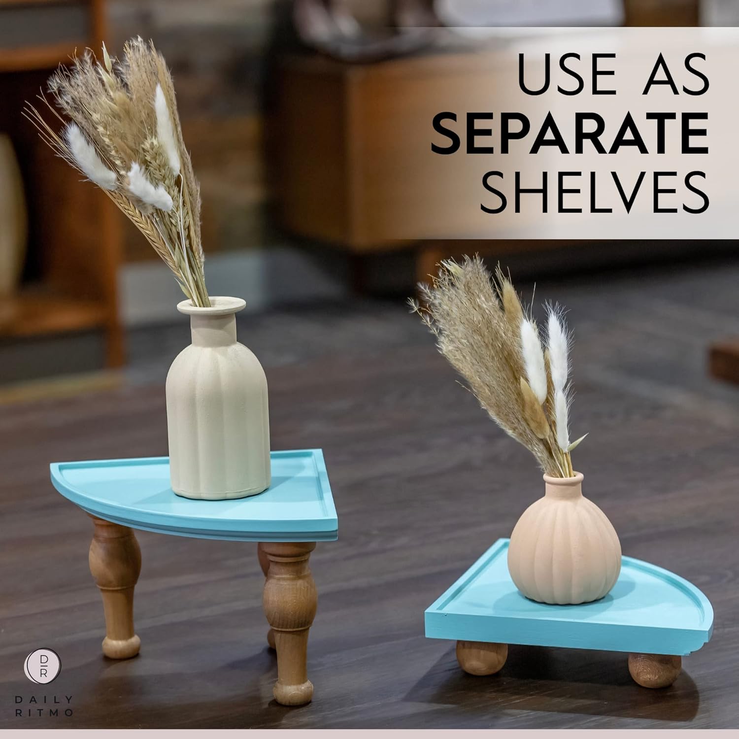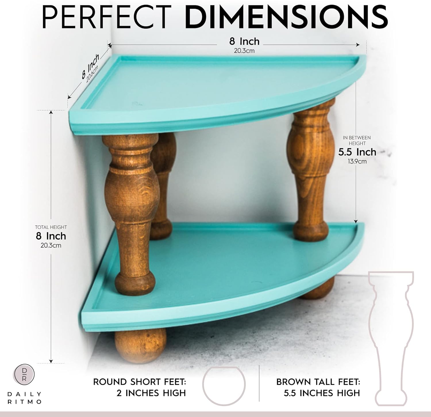 ✅ AQUAMARINE WOOD CORNER SHELF 2PC SET: Perfect for organizing spice jars, toiletries & more, this home decorating bundle includes a pair of stackable corner shelves (one with 2″ round feet, one with 5.5″ brown spindle legs).
