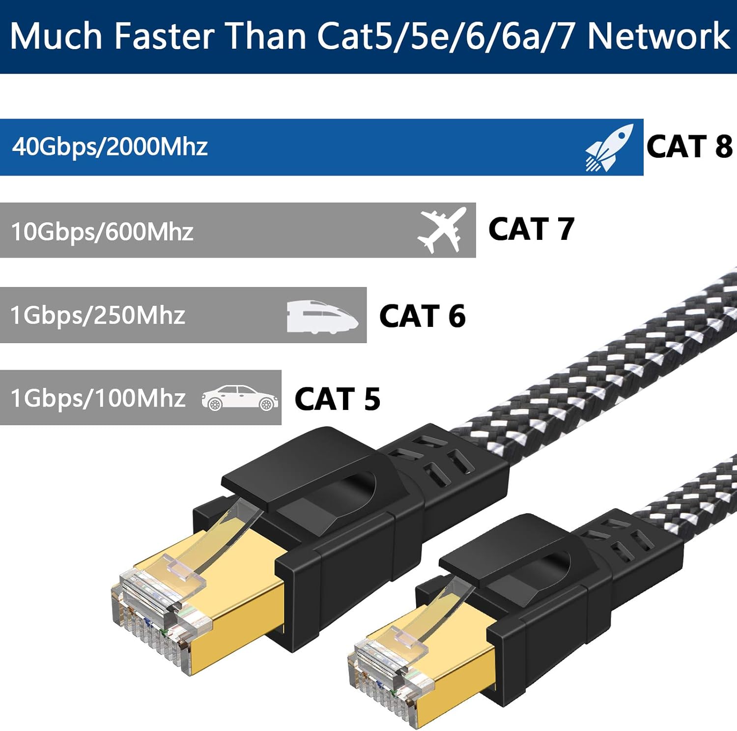 High Quality: The Cat 8 Internet Cable 100ft features gold-plated RJ45 connectors and a double-braided nylon outer layer to reduce EMI/RFI interference and provide high fidelity for long-distance data transmission. This sturdy Cat 8 jumper can be bent at least 100,000 times, so you can reuse it without any worries. With high-quality cat 8 Fast Ethernet cables, you can enjoy faster, safer networking. The perfect Ethernet cable for PS4 and PS5